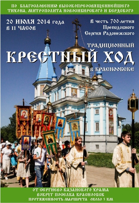 Традиционный крестный ход в Краснообске20 июля 2014 года, в Краснообске, пройдет традиционный Крестный ход, посвященный престольным праздникам Сергиево-Казанского храма пос.Краснообск: в честь 700 летия Преподобного Сергия Радонежского. Свое шествие Крестный ход начнет по окончании Божественной Литургии, которая начнется в 09.00., от Сергиево-Казанского храма (пос.Краснообск, ул. Западная, 1), и пройдет вокруг поселка Краснообск. Начало Крестного хода около 11.00.