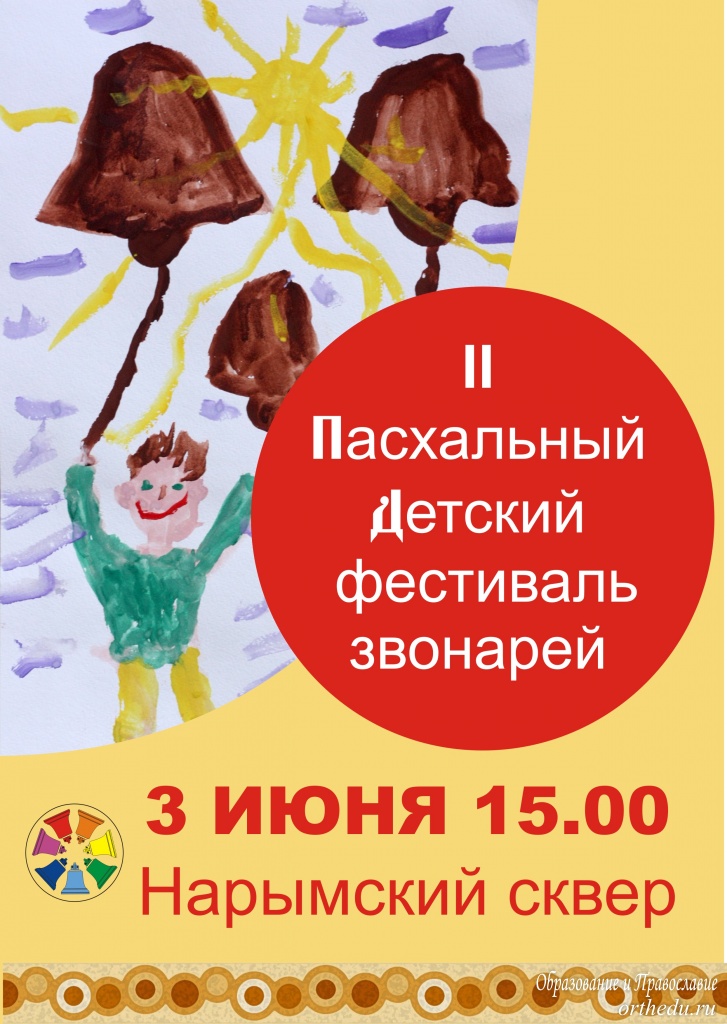 3 июня состоится II ДЕТСКИЙ ПАСХАЛЬНЫЙ ФЕСТИВАЛЬ ЗВОНАРСКОГО ИСКУССТВА!3 июня 2012 в воскресенье в 15.00 в Нарымском сквере возле памятника святым Петру и Февронии Муромским состоится фестиваль юных звонарей. Мероприятие откроет торжественное выступление Камерного хора Новосибирской государственной филармонии под управлением народного артиста России Игоря Викторовича Юдина. После чего начнется основная программа в которой будут представлены около 20 юных участников фестиваля, которые исполнят свои звоны на двух передвижных звонницах. Во время звонов для всех желающих слушателей будут организованы подвижные игры. Кроме того, после фестивальной программы все желающие смогут попробовать себя в роли звонаря - будет обеспечен свободный доступ к колоколам. За получением дополнительной информации обращаться по телефону 8-952-902-30-48 .