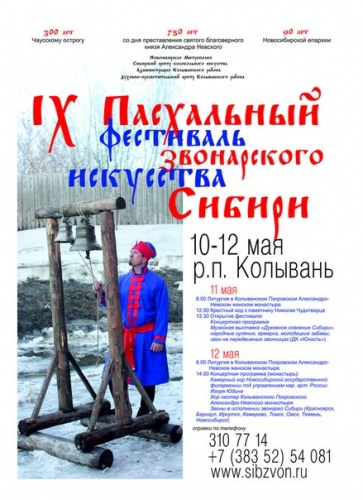 По благословению Его Высокопреосвященства, Высокопреосвященнейшего Тихона, Митрополита Новосибирского и Бердского с 10 по 12 мая 2013 года (в течение трех дней) в поселке городского типа Колывань Новосибирской области пройдет IX Пасхальный фестиваль звонарского искусства Сибири.