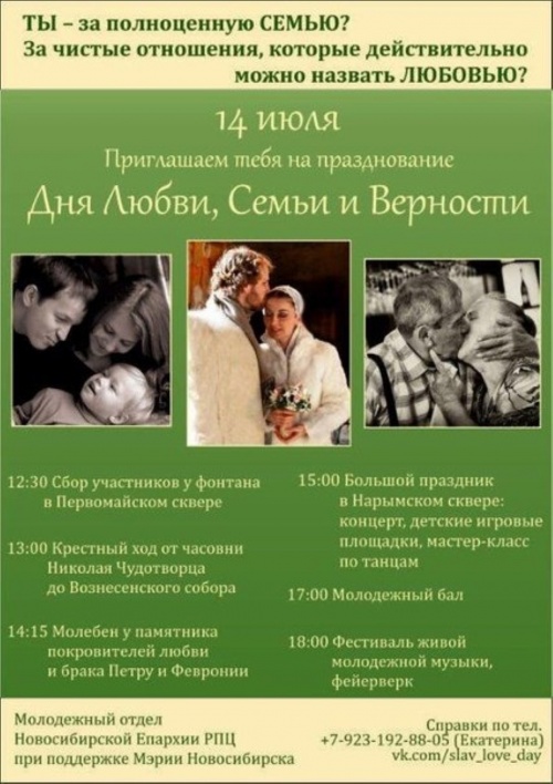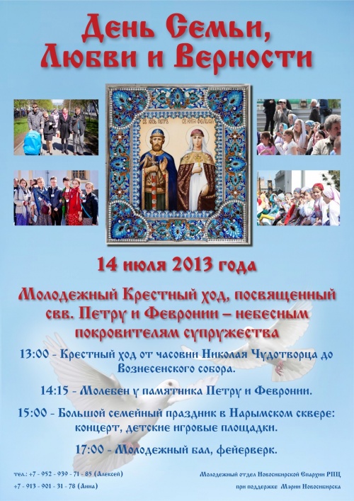 14 июля от часовни св. Николая Чудотворца начнется молодежный крестный ход в честь Дня святых Петра и Февронии Муромских14 июля 2013 года, по благословению Высокопреосвященнейшего Тихона, Митрополита Новосибирского и Бердского, впервые в Сибири состоится Молодежный Крестный ход, посвященный дню памяти святых благоверных князя Петра и княгини Февронии, Муромских чудотворцев – Дню Семьи, Любви и Верности. http://vk.com/club54411844 Свое праздничное шествие Молодежный Крестный ход начнет в 13.00. от Никольской часовни (Красный проспект, 17а) и пройдет по Красному проспекту и улице Гоголя к памятнику св. блгв. кнн. Петру и Февронии Муромским, расположенном в Нарымском сквере, со стороны улицы Советская. У памятника св. блгв. кнн. Петру и Февронии Муромским чудотворцам, православным покровителям семьи, будет отслужен молебен, после которого, в 15.00., в Нарымском сквере состоится праздничная программа, молодежный бал и фестиваль рок-музыки. В мероприятиях примут участие представители молодежных отделений русского, белорусского и украинского культурных центров и «Землячества народов Грузии». Кроме того, с 14.45. до 17.00., на территории Нарымского сквера, параллельно с концертной программой, для участников Праздника будут проводиться: бесплатные фотосессии, показательные выступления сильнейших людей Новосибирска, мастер-классы по танцам, выставка ремесленников, для детей и их родителей будут организованы игровые площадки и творческие мастерские + сюрприз «Счастливый голубь». Завершатся праздничные мероприятия красочным фейерверком. Для участия в Праздничных мероприятиях, приглашаются ВСЕ желающие, кому дороги Православные семейные ценности и традиции! Организаторы: Молодежный отдел Новосибирской митрополии при поддержке Мэрии Новосибирск Контакты: Дубровская Екатерина (8-923-192-88-05), Широких Алексей (8-952-939-71-85), http://vk.com/slav_love_day