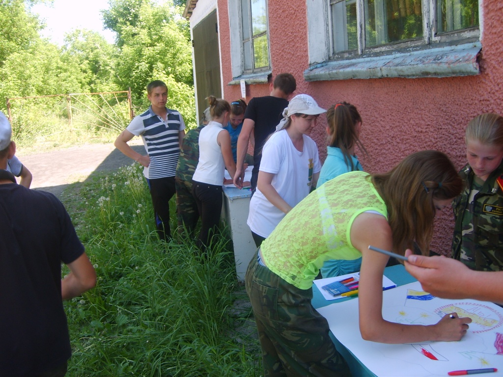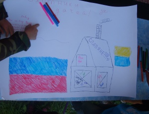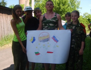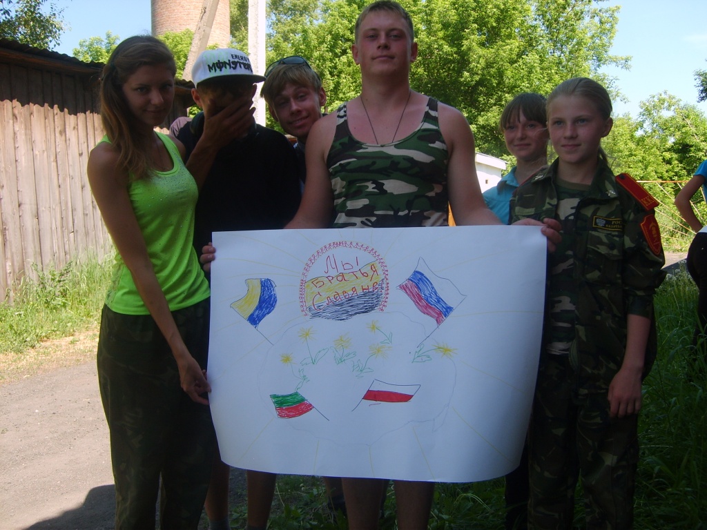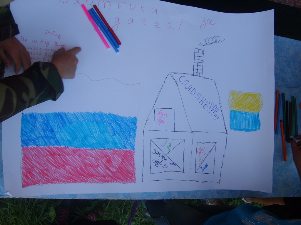 1. Конкурс «Нарисуй». Команды выполнили задание на тему праздника — нарисовали небольшие композиции, в которых отразили жизнь славянских народов. «Гении» нарисовали своего рода планету и на ней много людей, держащихся за руки, показав дружбу славян. У «Охотников за удачей» центральным рисунком стал домик, где в каждом окошке они написали свои имена, а на крыше поместили яркое слово «Славяне!!!», показав единство команды.