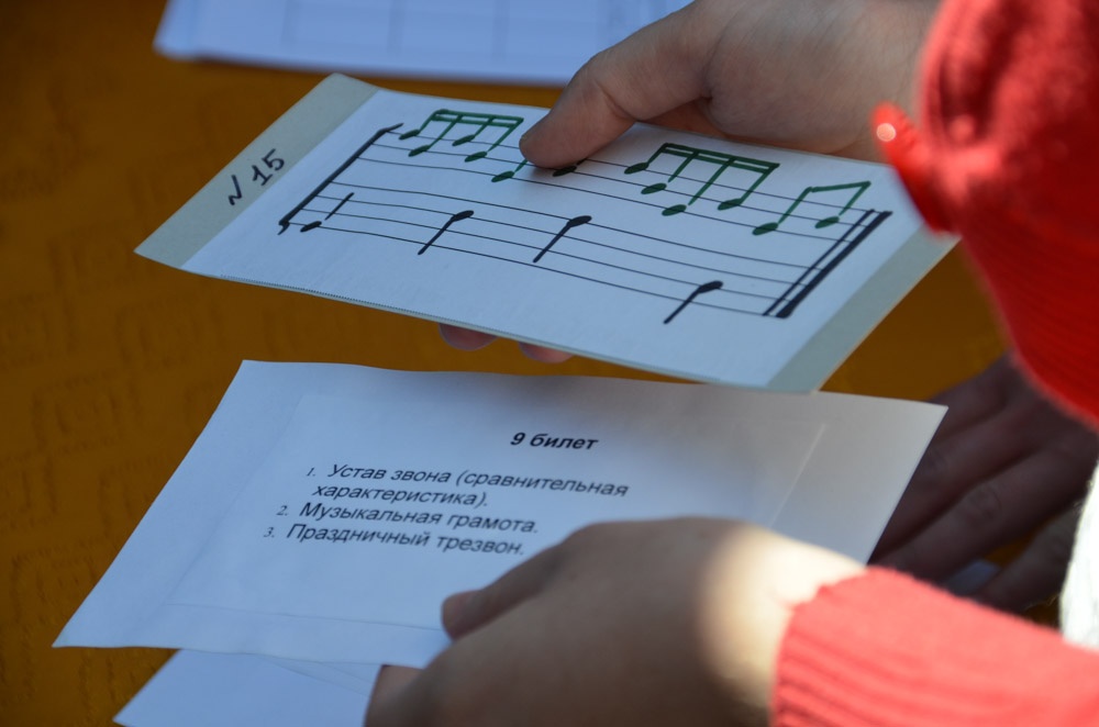 Первая часть экзамена – практическая. Ученики берут экзаменационные билеты: каждый получает один вопрос по теории и карточку с записанным нотами ритмом. Марина Владимировна Васильева, преподаватель Школы звонарей, успевает пошутить: «Счастливый билет?» – И кто-то, не замечая иронии, отвечает: «Да!» – С волнением трудно справиться в любом возрасте.