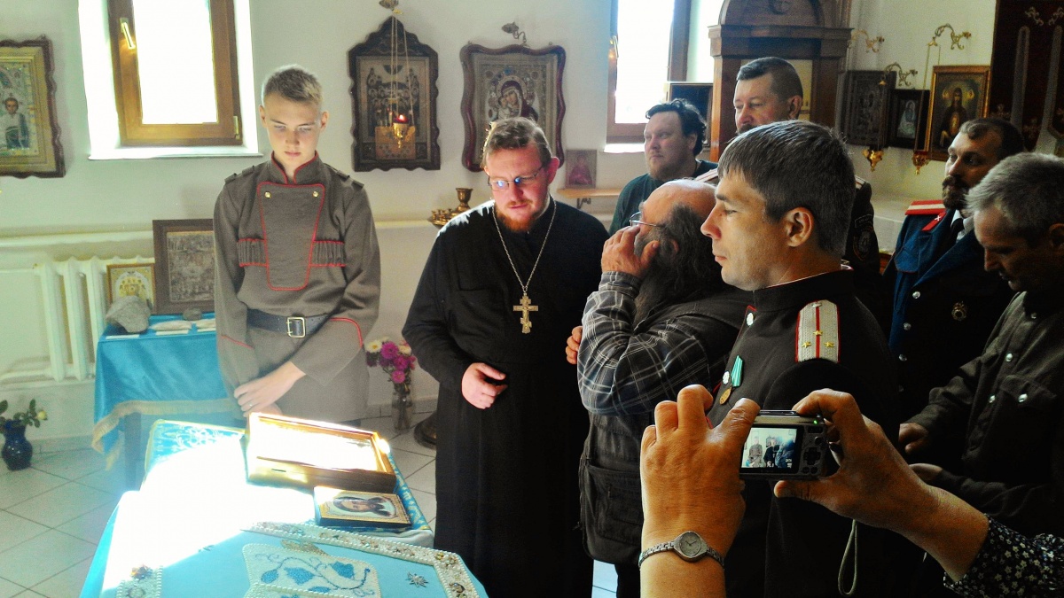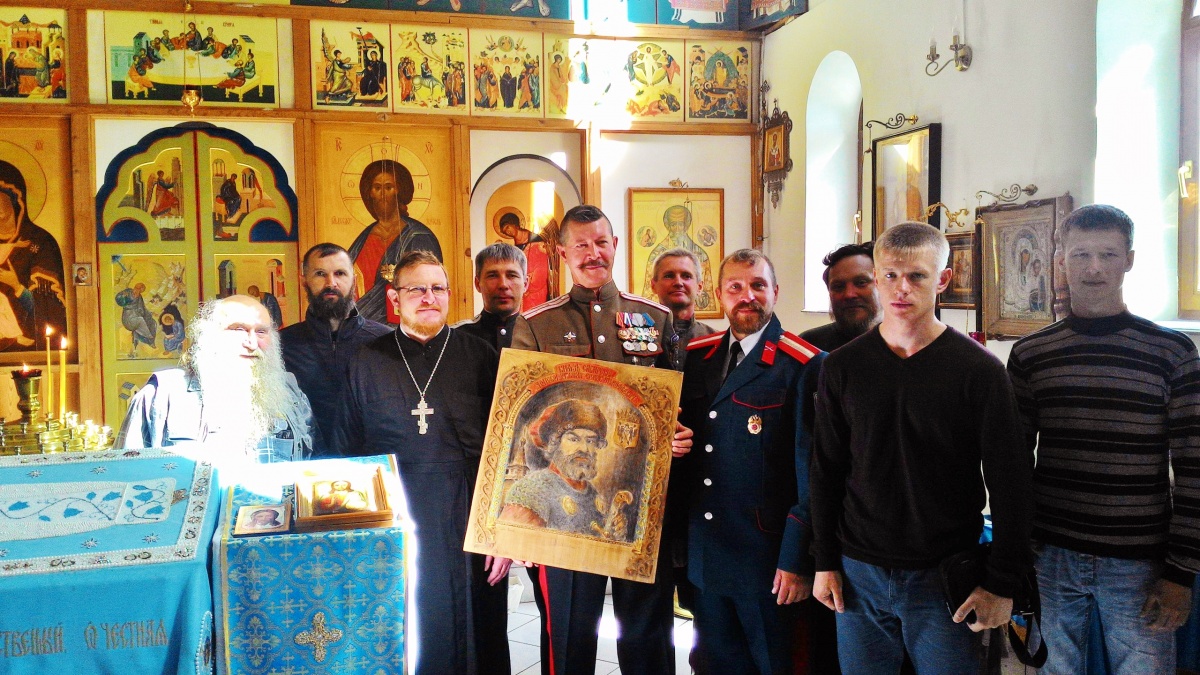 После молебна атаман Владимир Михайлович Титов рассказал об обретении иконы и исторических артифактах, относящихся к походам казаков дружины Ермака Тимофеевича против Кучума. Также представил свою лепту-портрет Атамана Ермака.