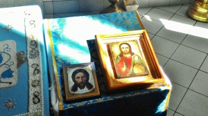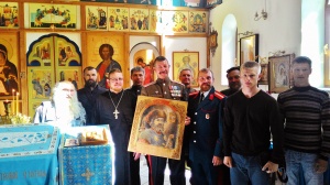 В прошлом году казаки соорудили сруб в этом месте-курень Сурьинского хутора, по названию одной из речек, берущей начало из этих мест. Там совершили панихиду по казацкому атаману Ермаку Тимофеевичу и его товарищам, всем ратным людям за веру, отечество и народ жизнь свою положившим и совершили освящение крова, открытого для всех приходящих на сие достославное место ратного подвига. Здесь и выяснилось обстоятельство обретения Святого Образа Спасителя и состоялась договоренность о чествовании реликвии казачьего отряда в храме Свт.Николая.