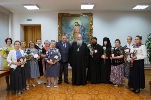 Представители Новосибирской Епархии получили награды в честь 80-летия Новосибирской области15 июня в большом зале Новосибирского Епархиального управления первый заместитель мэра Новосибирска Г.П. Захаров вручил медли в честь 80-летия Новосибирской области сотрудникам епархиальных структур. От лица Губернатора Новосибирской области первый заместитель мэра Новосибирска Геннадий Павлович Захаров поздравил представленных к наградам и поблагодарил их за труд на благо Отечества. В этот день наград удостоились: иерей Георгий Нестеров - настоятель прихода во имя преподобного Серафима Саровского, руководитель Миссионерского отдела Новосибирской Епархии; игумения Надежда (Ерёмина) - настоятельница Покровского Александро-Невского епархиального женского монастыря р.п. Колывань; Воронкова Наталья Викторовна - регент архиерейского хора Вознесенского кафедрального собора; Гелимханова Наталья Владимировна - психолог Отдела по тюремному служению Новосибирской Митрополии; Егорова Татьяна Валерьевна - регент детского хора Вознесенского кафедрального собора; Заливчая Лидия Петровна - директор воскресной школы Иоанно-Предтеченского епархиального мужского монастыря; Конкина Ольга Николаевна - преподаватель воскресной школы прихода в честь Успения Пресвятой Богородицы (Кировский район); Павлова Ольга Владимировна - заместитель директора по учебной работе воскресной школы Вознесенского кафедрального собора; Реморова Татьяна Ивановна - руководитель подотдела по воскресным школам Отдела образования и просвещения Новосибирской Митрополии, директор воскресной школы Вознесенского кафедрального собора; Руденко Ирина Ивановна - епархиальный архитектор; Сальникова Ираида Петровна - сотрудница Отдела культуры Новосибирской Митрополии, композитор; Шишкина Татьяна Альбертовна - секретарь Ученого совета Новосибирской Православной Духовной семинарии. Епархиальный медиа-центр, фото М. Пучкова