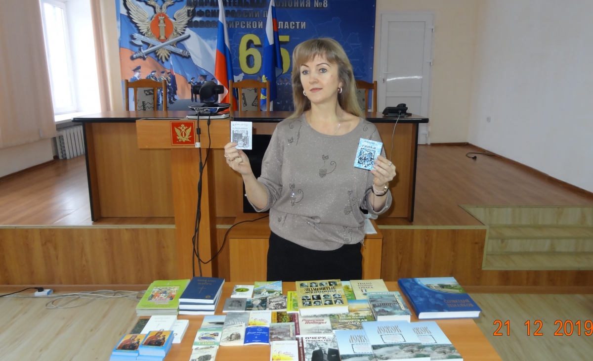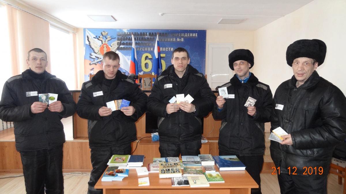 Презентация миниатюрных книг новосибирских поэтов в ИК 821 декабря 2019 года, в исправительной колонии поселения №-8 прошла презентация серии миниатюрных книг новосибирских поэтов. В 2019 году, «Общество книголюбов» отмечает 45-летний юбилей. Основными целями и задачами организации являются: осуществление культурно-просветительской деятельности; популяризация русской литературы и произведений сибирских писателей; воспитание любви к книге и чтению; осуществление издательской деятельности; выпуск и пропаганда литературы по краеведению. Проводятся масштабные областные мероприятия: творческие встречи с авторами, литературные вечера, премьеры книг, карнавалы литературных героев. Ведется работа городских и областных клубов авторов: «В начале было Слово», «Таланты земли Сибирской», «Новосибирская миниатюра» (для любителей миниатюрных книг). При правлении общества книголюбов работает редакционно-издательский центр «Светоч». С 1998 года действует лауреат областной премии, проект «На берегах Оби широкой». Идет издательство некоммерческих книг сибирских авторов в сериях: «Душа обязана трудиться», «Не хлебом единым», «Достойные имена Новосибирска». Многие из них были представлены на презентации в исправительной колонии поселения - №8. Деятельность «Общества книголюбов » направлена на тех, кому интересна литература сибирских авторов, устное и печатное слово, кто не равнодушен к истории родного края. В библиотеку учреждения были переданы книги сибирских поэтов. В завершении встречи последовала фотосессия на память. Редактор издательского центра «Светоч», руководитель «Общества книголюбов», член Союза журналистов РФ Н. Пендюрина-Капина