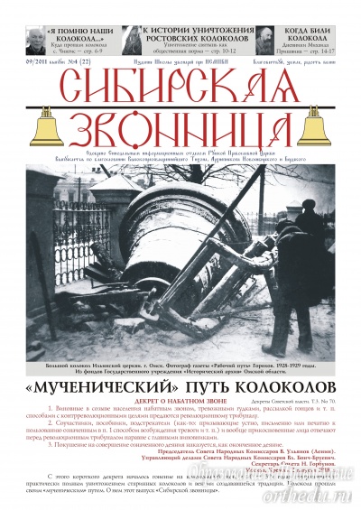 Вышел в свет очередной номер издания «Сибирская звонница»Вышел в свет очередной номер издания «Сибирская звонница» №4 (22) за 2011 г. Одобрено Синодальным информационным отделом Русской Православной Церкви, Издательским советом Новосибирской епархии. Главный редактор: Лариса Дмитриевна Благовещенская. Читайте в номере: «Тема номера»: ««Мученический» путь колоколов» - фотографии уничтожения древнейших колоколов Троице-Сергиевой Лавры, сделанные зимой 1929 года писателем М.М.Пришвиным. «Интервью»: «Я помню наши колокола…» - интервью с очевидцем разграбления храма во имя святых апостолов Петра и Павла в селе Чингис Новосибирской области. «Страницы истории»: «Об изъятии излишних колоколов» - декрет председателя совета народных комиссаров РСФСР Д. Сулимова об изъятии колоколов от 14.11.1930 г.. «Церковь и общество»: «К истории уничтожения ростовских колоколов» - историк, кампанолог и музеограф Алла Веденеева об уничтожении колоколов в Ярославской области. «Автограф классика»: «Когда били колокола» - отрывки из дневников Михаила Пришвина. «Авторский блокнот»: «Прикосновение к чуду» - записки завуча Школы звонарей при колокололитейном заводе «ЛИТЭКС» Екатерины Головизниной о «встрече» с возвращенными колоколами Свято-Данилова монастыря (г. Москва). Печатный номер издания спрашивайте в церковных лавках города.