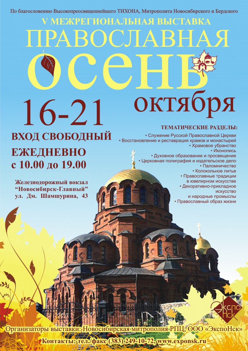| С 16-21 октября в Новосибирске пройдет Четвертая межрегиональная выставка «Православная осень 2015». Выставка будет проводится в здании Железнодорожного вокзала «Новосибирск- Главный» по адресу ул. Дм. Шамшурина, 43. Проезд до остановки «Железнодорожный вокзал» или ст. метро «Площадь Гарина-Михайловского».