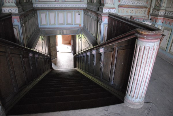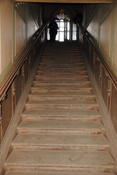 Поднимаемся по лестнице на второй этаж. Как говорится, в горний мир спален и светлых залов. Тут же витражная дверь в светелку
