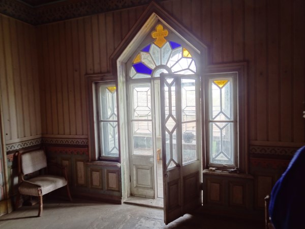Тут же на первом этаже есть интересная комнатка-светелка с родными цветными стеклами.