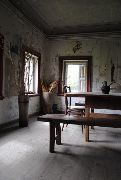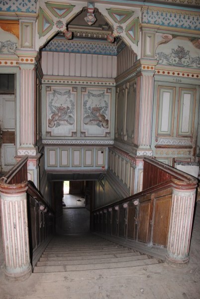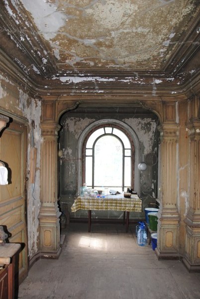 Из этого помещения выглядывает переложенная в советские годы кухонная печь. Когда-то тут был даже детский интернат - готовили на этих печах, уложив на них огромные обрезки рельс. Выглядит страшно. Думаю, в хозяйские времена все было изящнее и удобнее.
