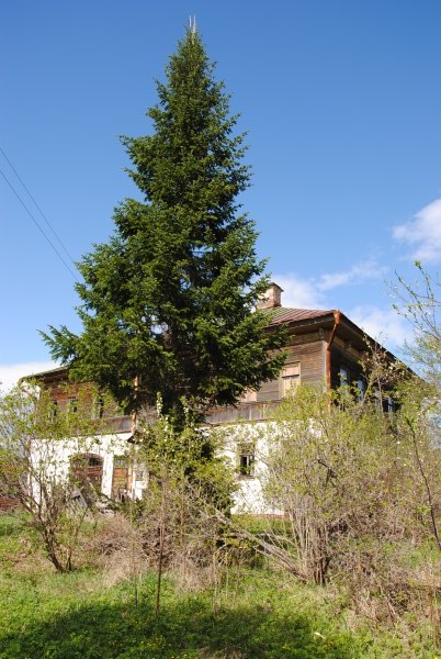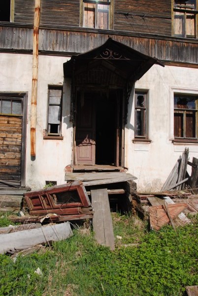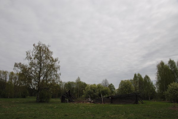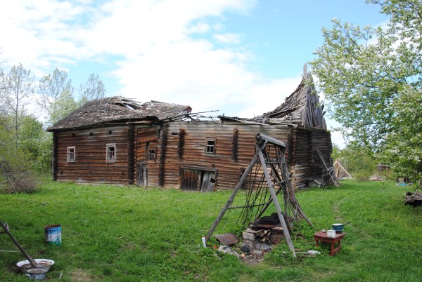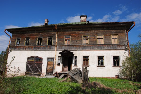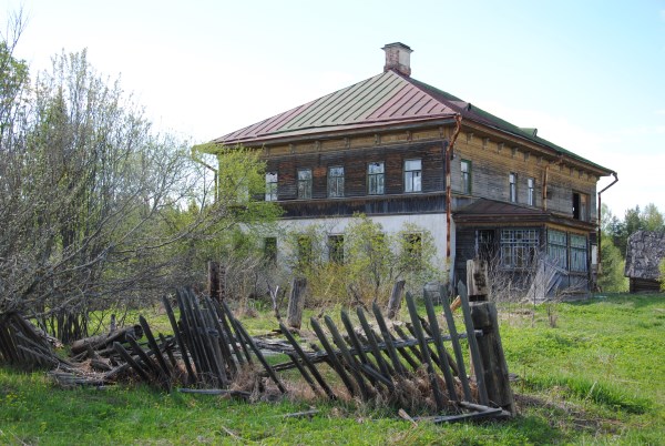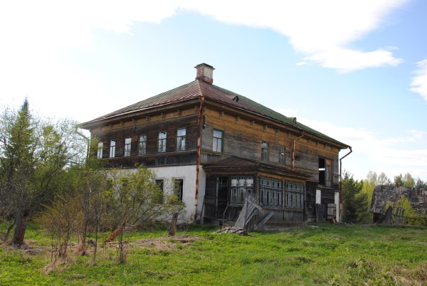 От болотца дорога сразу выводит вверх, на коренной берег реки, в Погорелово. Тут уже не угадать улиц - многие дома совершенно развалились, а какие-то если и стоят, то как-то обособленно. Приехавших встречает остов шикарного крестьянского дома в два этажа. Дом Варгасовых.