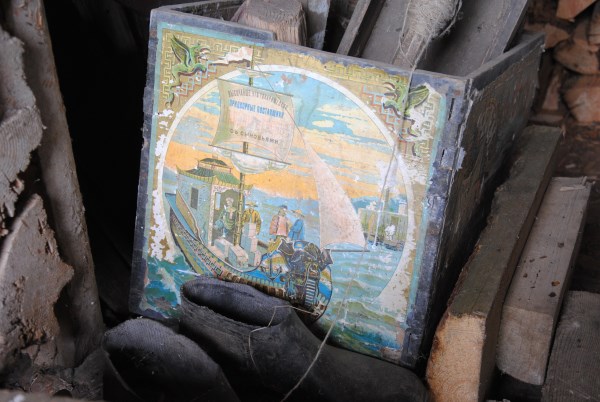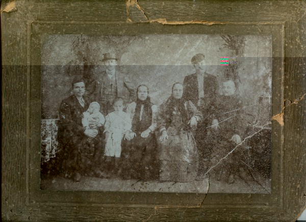 Судя по распортрошенным открыткам, календарям и журналам, дом был жилым всю советскую эпоху. Нам удалось узнать, что он принадлежал зажиточному крестьянину Василию Николаевичу Канаеву. Построен в 1897 году. Семью не выселяли из дома, и потомки его жили там до 2009 года, занимая последние годы, правда, только половину дома. Деревня вымерла, дом был дачей, но стоило потомкам не приехать год-два - дом разграбили. Вот старинная семейная фото семьи Василия Николаевича. Где он тут - непонятно. Предположительно - тот, кто справа