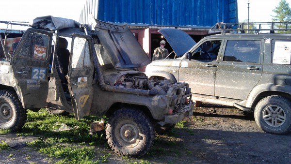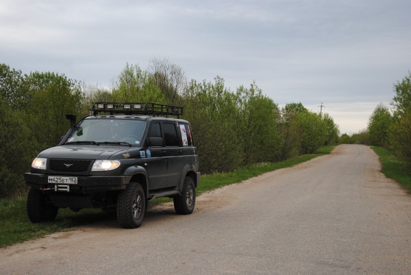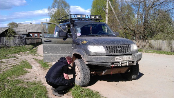 Без амортизатора, на пружине мы доехали до Галича, где посредством общения с местными владельцами дизельной шишиги, мы выехали в деревню Лаптево, где в гараже нас ждали на сварку клёвые ребята, которые тоже верят, что УАЗ всегда ранен, но никогда не убит