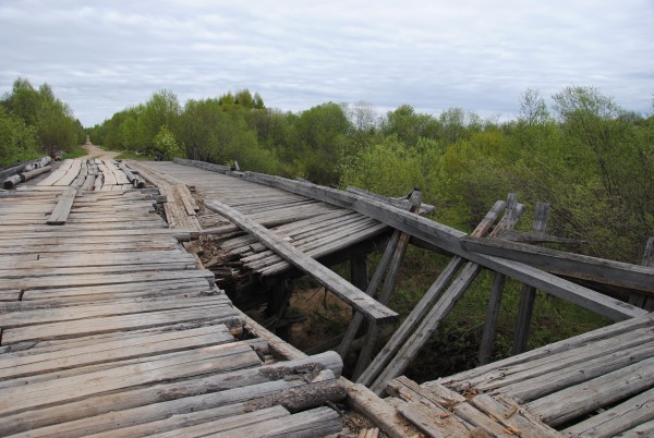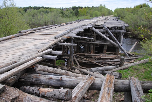 Проехали пару деревень и в Гольцово нас ждал мост через речку Вигу. Мост был слегка не в форме