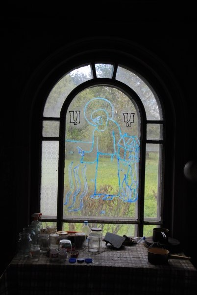 Друг-художник нарисовал на стекле Макария Унженского - покровителя Погорелово. День его памяти, 7 августа - престольный праздник Погорелово. Хотя деревня давно уже вымерла, окрестные жители все еще помнят о празднике. Хотя мне показалось. что очень похоже на образ Серафима Саровского, которого Анатолий Иванович тоже почитает. Он, рожденный под Арзамасом, считает, что родился на земле этого святого. Правда, в разговоре выяснилось, что Анатолий Иванович путает Арзамас и Арзамас-16, то есть закрытый город Саров. Но мы ему все объяснили и даже рассказали, как туда можно добраться, чтобы посетить Дивеево и посмотреть город, где сам родился.