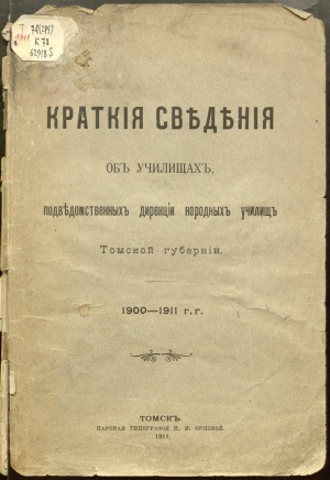 Краткие сведения об училищах, подведомственных Дирекции народных училищ Томской губернии, 1900-1911 гг. - Томск, 1911Томская дирекция народных училищ. Краткие сведения об училищах, подведомственных Дирекции народных училищ Томской губернии, 1900-1911 гг. — Томск : Паровая типография Н. И. Орловой, 1911. — 23, [1] с. ; 26 см.