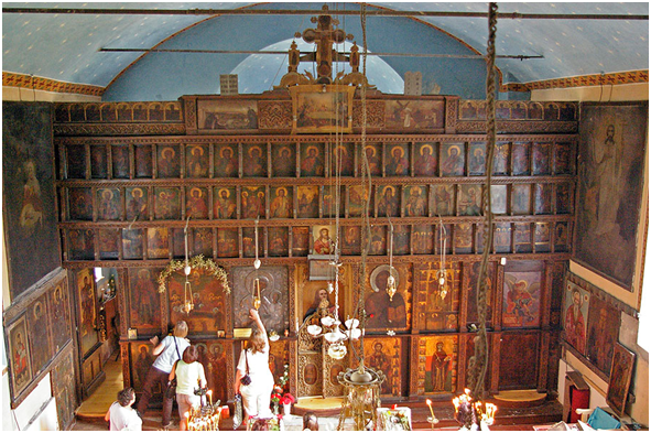 Церковный иконостас. Фото: Мартин Митов. Источник: www.iskoni.com Гармонично контрастируют со старинными православными образами, иконостасом и архиерейским троном и стенные церковные росписи сделаны в наше время. Стенописи и скамьи для прихожан стали реальностью благодаря большим усилиям священника Ивана Пенкова и местных ктиторов, чьи имена написаны над входом средней части и на западной стене притвора Святоуспенской церкви. В восточной части церковного двора находится небольшое кладбище, где они похоронены священнослужители, когда-либо служившие в этом Божьем доме. До недавнего времени в церкви находилась вышитая золотыми нитями плащаница с рисунком похорон Сына Божьего. Ей более 4-х веков. Она была создана в 1569 году. Этот предмет старины был похищен. К великому счастью, плащаницу удалось найти и вернуть в старопрестольный град.