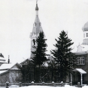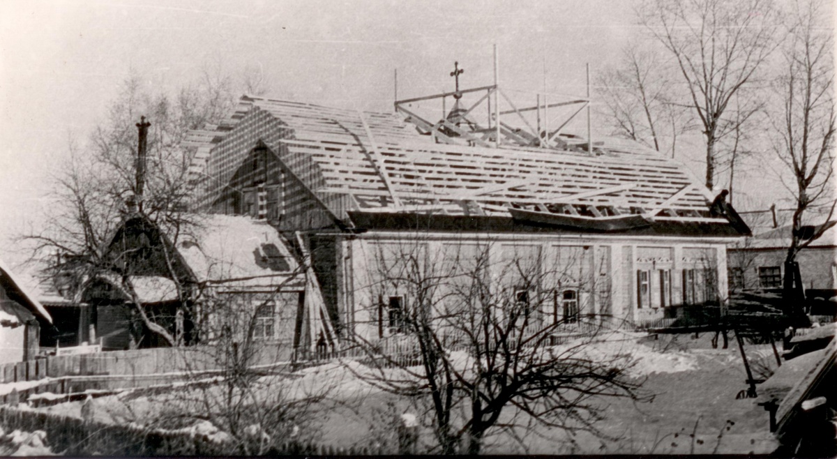 Новое здание Никольской церкви перестраивается из дома в храм. Болотное. 1959 г. Предлагаю вашему вниманию отрывок из уникального донесения настоятеля Болотнинского храма иерея Михаила Иванова отцу благочинному Александру Тугаринову в Новосибирск от 30 октября 1958 года: «В конце 1945 года Высокопреосвященнейший Варфоломей, Архиепископ Новосибирский и Барнаульский назначил Священника о. Стефана Афиногеновича Крылова в гор. Болотное, который, зарегистрировавшись у Уполномоченного по делам Р.П.Ц. гражданина Созоненок П.Н., стал исполнять требы и молиться в собственном доме Земцова Т.Е. По истечении семи месяцев перешли молиться к гр-ке Вужаркиной А.М., проживающей в гор. Болотное по улице Октябрьская, 25. Священник о. Стефан стал хлопотать о разрешении для покупки дома под молитвенный дом. Разрешение было дано, и несколько членов «Двадцатки» стали ходить по домам, собирая деньги. Ходили: Наталья Костоусова, Матрона Лосева, Агафья Вужаркина и др. На собранные деньги купили дом за 65 тысяч у гр-на Петрова В.Н., проживающего в гор. Болотное по улице Вторая Кондукторская, 7. 5-го сентября 1946 года из купленного дома сделали молитвенный дом. Сначала было бедно и убого. Иконы приносили верующие. Загороженный угол иконами служил Алтарем. Сосуды были из белой жести, облачение священника – из крашенного холста. Пели певчие – любители. Управляла певчими инокиня Анастасия Онуфриевна Комаровская, она исполняла обязанности псаломщика. По благословению и решению архиепископа Варфоломея храм, т.е. молитвенный дом, ввиду сложившихся обстоятельств, продолжали расстраивать на Северо-Восток. Отец Стефан Крылов, 1868 года рождения, инвалид 2-й группы по старости, бессемейный /вдовец/. При Священнике Крылове были сделаны работы по ремонту молитвенного дома: купили сруб в деревне и сделали прируб, чем и расширили храм, а внутри вырезали арку. 19-го января 1946 года были зарегистрированы члены Ревкомиссии, члены церковного Совета у Уполномоченного по делам Р.П.Ц. Прослужив 2 года и 3 месяца, отец Стефан Крылов скончался 3-го января 1948 года. На городском кладбище имеется могила с огромным металлическим крестом от бывшей церкви, которая сгорела» 30 . Величественное храмовое здание, в котором был открыт кинотеатр «Победа» сгорело в 1952 году. На месте, где когда-то возвышался храм, сейчас установлен православный поклонный крест.