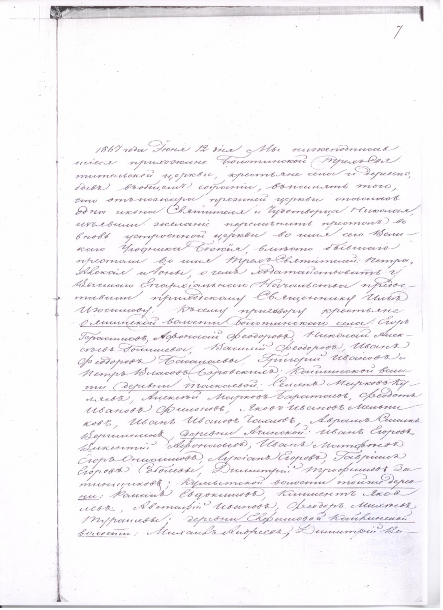 ![]() Обращение болотнинцев с просьбой переименвать храм в (ГАТО Ф. 170. Оп. 3. Д. 394. Л. 7.). 12 июня 18767 г.