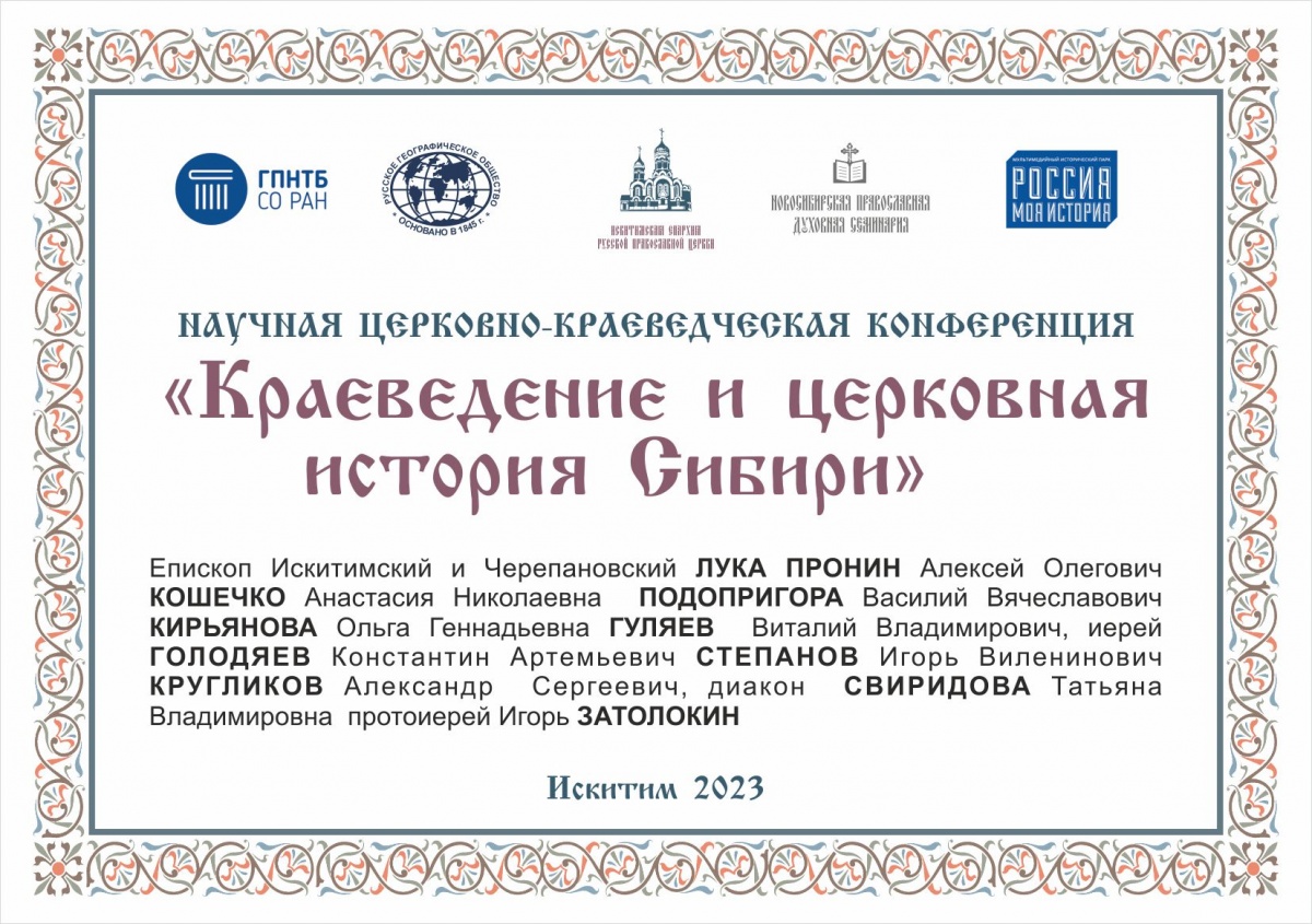 «Краеведение и церковная история Сибири» Дорогие друзья. 4 апреля 2023 года в Духовно-просветительском центре Искитимской епархии по адресу: г. Искитим, ул. Коллективная, 1, состоится научная церковно-краеведческая конференция «Краеведение и церковная история Сибири» Организаторами конференции выступили: - Искитимская епархия Новосибирской митрополии Русской Православной Церкви - Администрация г. Искитима - Новосибирская православная духовная семинария Новосибирской Епархии Русской Православной Церкви - Новосибирское региональное отделение Русского географического общества -Государственная публичная научно-техническая библиотека Сибирского отделения Российской академии наук - Мультимедийный исторический парк «Россия – моя история» - Научный журнал «Живоносный Источник» На конференцию приглашены ведущие специалисты-историки, краеведы, богословы из Новосибирска, Москвы, Красноярска, Томска, Барнаула, Кемерово и Тюмени. Программа конференции