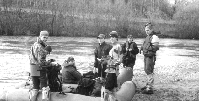 Среди нашей команды трое "бывалых": Николай Елизаров, Евгений Тулиглович, Сергей Соколов. Все они - выпускники приходской воскресной школы, после которой пошли в клуб. За плечами по два больших пеших похода и прошлогодний сплав. Для них не проблема ночевка в палатке, когда температура ночью - чуть выше нуля, не проблема - приготовить на костре пищу, даже под дождем. В походе они чувствуют себя как дома. Женя с Сергеем плавали с клубом еще и по Бердскому заливу на четырехвесельном яле, хотя там совсем другие принципы, но и это - опыт. Василий Ушаков тоже из приходской школы, пешие походы он прошел, а на сплаве впервые. Из новичков: Данил Шуваев (его младший брат - в нашем клубе, а старший занимается в "Русском щите", у Д.Н. Семенова) и Сергей Ларионов (его привел Женька, смог увлечь рассказами о прошлогоднем сплаве). Взрослых двое (по одному на лодку): священник Андрей Ромашко и Николай Викторович Тетюцкий.