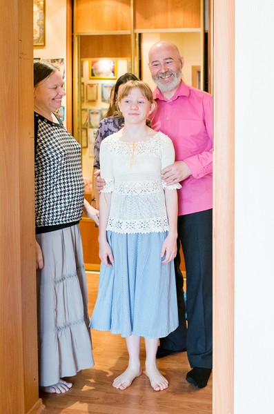 Папа с Леной. Большой Саша (зять), художник, сказал, что нехорошо, когда все в одинаковой одежде. Как не разочаровать в вереНаталья: Мы специально не занимаемся вопросом "как приучить детей к вере". Мы живем с мужем этим, и дети просто идут за нами. Старшая дочка окончила ПСТГУ, сейчас пишет иконы. Никаких протестов вроде "не пойду в Церковь" у них я не помню. Василий: Федя иногда говорит: "Не хочу в храм!" Я ему говорю: "Федь, понимаешь, очень хочется помолиться. Пойдем, ты там с папой постоишь рядом. Может, на улице поиграешь. Я не могу не идти, меня в Церковь тянет, хочу помолиться. Я Бога люблю. Хочу послушать, как хор поет. И вместе с ним спеть: и "Верую", и "Отче наш". Пойдем штанишки надевать". И он начнет одеваться. Нужно стараться быть искренним. Ведь действительно хочется пойти в Церковь, молиться на Литургии. Пропустить это, отсрочить еще на неделю –тяжело! Но вообще обычно Федя услышит, как зазвонили колокола, сразу: "Идем в храм!" Наталья: Нам еще повезло вот в чем. Наши дети росли с храмом, который строился у нас во дворе. Со Светой, которая сидела в колясочке, ходили, когда освящали место под храм. Два года ходили на молебны, пока строительство "заморозилось" из-за отсутствия денег. С Симой в колясочке ходили закладывать камень в основание храма. Потом там долго стоял лишь цокольный этаж, один придел как бы в полуподвальном помещении. Вот в этом полуподвале, когда самого храма сверху еще не было, долго молились. Ощущение – словно в катакомбах первых веков христианства. Бывало, грунтовые воды прорывало, из храма звонили просто: "Ребята, придите, помогите, в храме надо просушить все, помочь протереть". Дети бежали. Потом верхнюю часть храма возвели, крест водружали, колокола поднимали. И дети не только присутствовали, а помогали. Мы одной жизнью с этим храмом живем. И дети воспринимают храм как свой дом, сами туда бегут. Они там дружат, влюбляются, встречаются, строят, поют, читают, встречают и провожают священников, обучают малышей, ездят с молебнами и концертами по больницам и детским домам, ходят в походы, паломничества и многое, многое… Все дети находят свое место в Церкви.