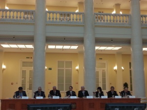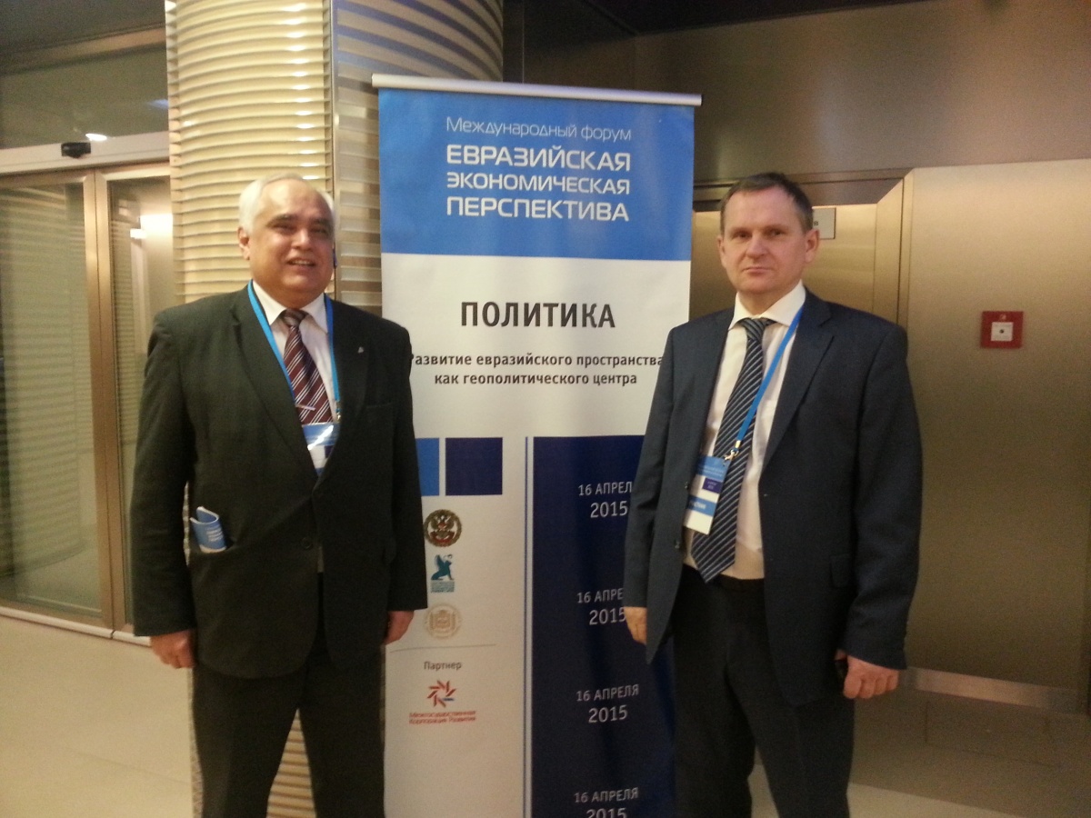Представители движения "Гражданский Мир" приняли участие в работе III Международного форума «Евразийская экономическая перспектива»16 апреля 2015 года в Президентской библиотеке им. Б.Н. Ельцина в Санкт-Петербурге прошел III Международный форум «Евразийская экономическая перспектива». Организаторами форма выступила Государственная Дума Федерального Собрания РФ и Санкт-Петербургский государственный экономический университет. В рамках программы форума состоялась пленарная сессия, модератором которой выступил Председатель Государственной Думы Сергей Евгеньевич Нарышкин. В работе форума приняли участие главы парламентов стран – участников ЕАЭС и СНГ, члены Коллегии Евразийской экономической комиссии, ректоры ведущих университетов – членов Евразийской ассоциации университетов, экономисты, политики и бизнесмены. В форуме также участвовали представители Международного общественного движения "Гражданский Мир" - председатель движения Николай Владимирович Быков, председатель татарского общества "Нур плюс" Ринат Рауфович Магдиев и другие. Главными темами, обсуждаемыми участниками форума, стали перспективы сотрудничества Евразийского экономического союза (ЕАЭС) со странами юго-восточной Азии, вопросы создания зоны свободной торговли, вопросы сохранения общего гуманитарного евразийского пространства в условиях мирового кризиса доверия. Напомним, что договор о создании Евразийского экономического союза был подписан в Астане 29 мая 2014 года, вступил в силу 1 января 2015 года. В настоящее время в союз входят Россия, Белоруссия, Казахстан и Армения, в мае к нему присоединится Киргизия. Цель союза – свободное движения товаров, услуг, капитала и рабочей силы, проведение скоординированной, согласованной или единой политики в отраслях экономики. После пленарной сессии началась работа пяти тематических круглых столов, посвященных экономике, политике, праву, образованию в рамках евразийской интеграции, а также молодежного круглого стола, на котором аспиранты и студенты смогли поделиться собственным видением существующих проблем. III Международный форум «Евразийская экономическая перспектива» прошел в высоком рабочем ритме, затронул самые актуальные вопросы, связанные с ЕАЭС, развитием евразийского сотрудничества и интеграции народов постсоветского пространства в целом, выступил дискуссионной площадкой с участием ведущих политиков, экономистов, правоведов России и стран СНГ. На фото: Президиум форума. Участники форума - председатель движения "Гражданский Мир" Николай Владимирович Быков и председатель татарского общества "Нур плюс" Ринат Рауфович Магдиев.