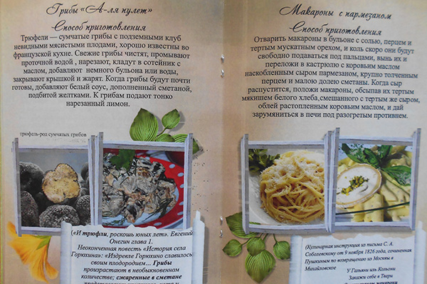— Но первое место отдали все же тебе. – Видимо, я все-таки сумела больше заинтересовать жюри. Но об этом я узнала лишь на следующий день после выступления, когда проходило награждение. Кроме золотой медали и грамоты, подписанной Министерством образования, мне вручили путевку в международный детский центр «Артек» на зимнюю тематическую смену «Юный исследователь». А еще несколько рецептов из сборника вошли в меню одного московского ресторана. Его директор обещала, что перечень блюд будут менять в зависимости от сезона года. — А где его можно прочитать? — Он есть не только в Липецке, но и во многих других библиотеках России и даже Казахстане. Туда он попал еще до менделеевского конкурса. В основном все эти библиотеки носят имя Пушкина. С какими-то из них связалась мама, а сотрудники некоторых вышли на нас сами. — Какие твои дальнейшие планы? — Продолжить исследования. Сейчас уже изучаю блюда из произведений Гоголя. Чего там только нет: и пампушки-вареники из «Вечеров на хуторе близ Диканьки», и настоящие поварские шедевры из романа «Мертвые души». В произведениях Гоголя так много блюд, что складывается ощущение, будто он писал только о еде. Правда, если у Пушкина они в основном русские, домашние, у Гоголя лакомства самые разнообразные. Когда закончу с этой книгой рецептов, планирую взяться за произведения Льва Толстого. Возможно, позднее опишу кулинарные предпочтения и других русских писателей эпохи Пушкина. Мы с Юлией Сергеевной со временем мечтаем открыть в Липецке литературное кафе, где будет представлено меню по сочинениям великих русских классиков. В Москве и Санкт-Петербурге ведь есть литературные заведения общепита. Чем Липецк хуже?