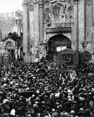 Май 1918 года. К вопросу о "совместимости" Пасхи и первомаяУже в начале 1918г. большевики издали т.н. «Декрет о свободе совести», тотчас получивший в народе название «Свободы от совести». Властию, данною Нам от Бога, запрещаем вам приступать к Тайнам Христовым, анафематствуем вас, если только вы носите еще имена христианские и хотя по рождению своему принадлежите к Церкви Православной. Заклинаем и всех вас, верных чад Православной Церкви Христовой, не вступать с таковыми извергами рода человеческого в какие-либо общения...» По всей России прошли многотысячные крестные ходы. В ряде городов безоружных богомольцев расстреливали из пулемётов. Верующие подвергались арестам. Но вера была сильнее страха. И, преодолевая его, холодным февральским утром 18-го года сотни тысяч москвичей с иконами и хоругвями пришли к Кремлю, где на Лобном месте Патриарх отслужил молебен. Столь же внушительной силой выступили верующие в мае того же года. Первого мая, пришедшегося на Великую Среду, большевики звали народ на праздничную демонстрацию, соблазняя невиданными зрелищами: фейерверками, прожекторами… Кремль едва ли не весь закутали в красную материю. Всемерно готовилась «иудина пасха». Между тем, по городу распространялась листовка с проповедью настоятеля храма Воскресения Христова в Сокольничьей слободе отца Иоанна Кедрова. «Будет и так много на нас греха! – говорилось в ней. - И так не знаешь, где найти отрады и покоя. Неужели ещё мало нам ужасов современной жизни, неужели мы хотим сознательно идти против Христа и основ святой веры в Него и окончательно уничтожить устои нашего измученного, опозоренного и разделённого Отечества, которое верою родилось, выросло, окрепло и было могучим?! Веру оставили, восстали на Церковь и Отечество и гибнем в мучениях за эти тяжкие дни! Что стало с нашей когда-то Святой Русью? Куда девался русский человек – христианин и патриот, для которого Отечество было всегда предметом его любви и святых подвигов?! Русский православный человек! Если ты не хочешь быть рабом других народов, для которых Россия, наше Отечество, лакомый кусок, а мы все – рабочая сила: на нас будут пахать землю и возить навоз – опомнись, пойми, что ты русский и никакие другие народы не дадут тебе защиты и спасения, все они преследуют только свои цели. Никто, только ты сам сможешь спасти себя от мучений и Отечество – от позора. Спасти не насилием, разорением и кровью своих отцов, братьев и сестёр в междоусобной войне… А спасти себя верою в Христа, Который ещё есть в тебе. Нас разделили на партии, чтобы во вражде и разделении мы сами себя опозорили и уничтожили; дошли мы до таких великих ужасов, кто может поручиться за жизнь на завтрашний день?!» Русские люди в то время ещё не забыли Христа, а потому в Первомай лишь совсем оголтелые партийцы и красноармейцы маршировали по Красной площади с пением «Интернационала». В самый же разгар «иудиной пасхи» свершилось чудо: прорвалось красное полотнище, застившее лик Николая Чудотворца на Никольских воротах, и образ святого воссиял в лучах солнца. И 9 мая, в день праздника Святителя, из всех московских церквей свершён был крестный ход к чудесному образу. Сотни икон, хоругвей, риз, крестов заполнили Красную площадь. Накануне многие причащались, готовились к смерти. Но отряды красноармейцев и чекистов, занявшие переулки, н