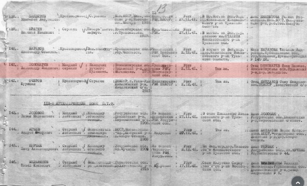 Дата и место призыва: Прокопьевский РВК, Новосибирская область, Прокопьевский район. Последнее место службы: 112 танковая дивизия. Воинское звание: мл. сержант. Должность и специализация: наводчик ручного пулемета. Причина выбытия: убит. Дата выбытия: 2 декабря 1941 года. Отец: Пономарев Иван Павлович. Адрес: Новосибирская область, Ордынский (Орданский) район, деревня Ваганцево. А сразу после публикации этой информации в группе «Наш Ясногорск» стало известно несколько новых фактов. В учетной карточке братской могилы, находящейся в селе Иваньково Ясногорского района, среди 75 известных имен числится Пономарев А.И. Это означает, что по официальной версии он считался все это время перезахороненным в Иваньково, а фактически его останки и смертный медальон все 75 лет лежали в первоначальном месте погребения – у деревни Павловское. Такое, к сожалению, встречается очень часто.