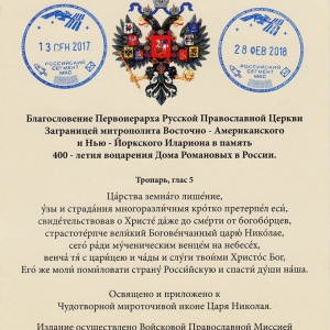 Бумажные иконы Святого Царя Николая были отпечатаны по благословению Первоиерарха Русской Православной Церкви Заграницей митрополита Илариона в память 400 - летия воцарения Дома Романовых в России.