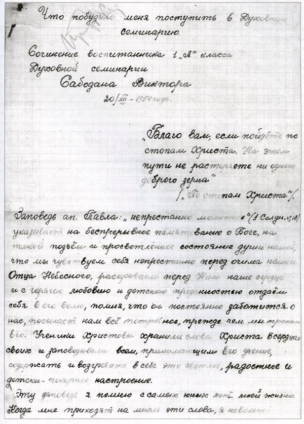 Митрополит Владимир (Сабодан). Что побудило меня поступить в Духовную семинариюСочинение митрополита Киевского и всея Украины Владимира (Сабодана), написанное им в 1-м классе Одесской духовной семинарии в 1954 году. ![]() «Благо всем, если пойдете по стопам Христа. На этом пути не растеряете ни одного доброго зерна» («По стопам Христа») Заповедь апостола Павла «непрестанно молитесь» (1 Сол: 5,17) указывает на беспрерывное памятование о Боге, на такой подъем и просветленное состояние души нашей, что мы чувствуем себя непрестанно перед очима нашего Отца Небесного, раскрываем перед Ним наше сердце, и с горячей любовью и детскою преданностью отдаем себя в Его волю, помня, что Он постоянно заботится о нас, посылает нам все потребное, прежде чем мы просим Его. Ученики Христовы хранили слова Христа в сердцах своих и заповедовали всем, принимающим Его учение, содержать и возгревать в себе это светлое, радостное и детски-покорное настроение. Эту заповедь я помню с самых юных лет моей жизни. Когда мне приходят на мысль эти слова, я невольно вспоминаю те вечера, прекрасные и какие-то особенно интересные, когда у меня дома собирались и читали Священное Писание. Они были такие очаровательные, что мне никогда не хотелось спать, а все слушать и слушать. О Духовной семинарии я знал с детства, и еще тогда зародилась мечта пойти в будущем туда учиться, чтобы получить духовное образование и пойти по истинному христианскому пути, «по стопам Христа». Еще маленьким я ходил в церковь и, будучи в первом классе, я начал посещать алтарь. Отец мой был церковным старостой, и поэтому я имел возможность приучаться и прислушиваться к церковной службе. Позже, по благословению Божьему, я начал прислуживать в алтаре. Так я и остался при церкви. Тетя моя стала псаломщицей, и тогда мне представилась возможность научиться читать по-славянски, а позже петь. Я начал читать и петь на клиросе. Все это было для меня очень интересным, и я так сжился с церковью, что не мог пропустить ни одного Богослужения. Надо мной смеялись. Меня презирали в школе и на улице. Часто приходилось слышать нехорошие слова и песни. Но при всем этом, мне было почему-то радостно и приятно. Да, радостно и приятно! Но как же было не радоваться, помышляя о том, что я - ничтожное существо, песчинка в океане, и я духовно могу соединяться с Всемогущим, Великим Богом. Ведь религия есть живой, сознательный и свободный союз человека с Богом. Я поставил себе цель в жизни, что должен с любовью воспринимать богооткровенные истины и стараться всеми силами исполнять Божественную волю. Ведь Бог открыл мне свет, Бог дал возможность стремиться к уразумению причины всех причин, стремиться к Нему, Который все знает. «Болий есть Бог сердца нашего, и весть вся» (1 Ин: 3, 20). По окончании десяти классов, когда обычно все молодые люди избирают себе путь в жизни, я твердо и уверенно решил осуществить свою заветную мечту, что пойду по истинному христианскому пути. Мне пришлось после окончания школы говорить со своим епископом, от которого я услышал слова: «Вы — будущий работник духовной жизни. Что вы внесете в жизнь, с тем она и пойдет дальше. Ваш характер пока еще не установился; душа мягка и податлива, юное сердце кипит, как расплавленный металл. Следите за собой. Будьте достойны своего избранного пути!» Эти слова во многом мне помогли, еще больше