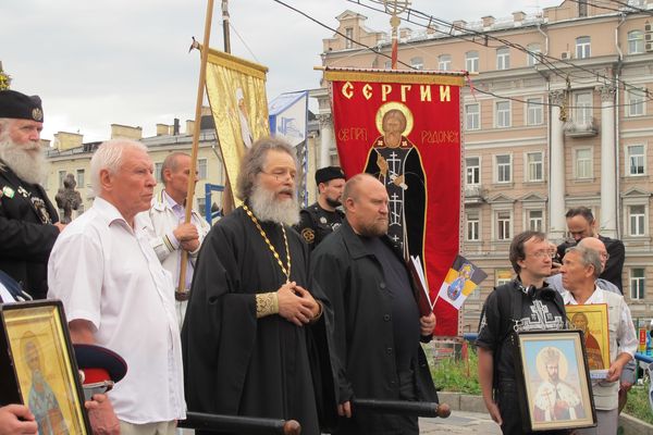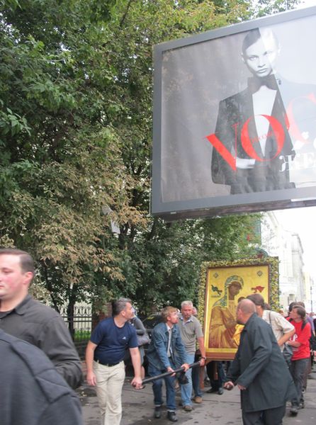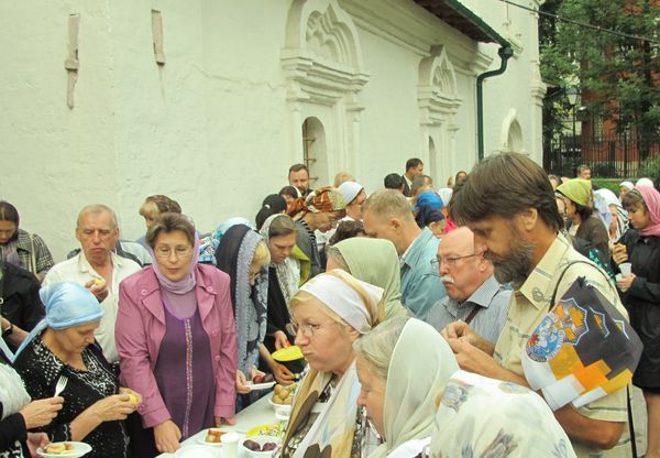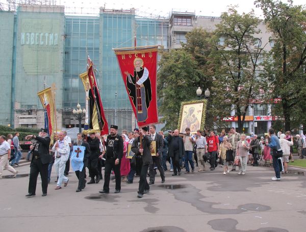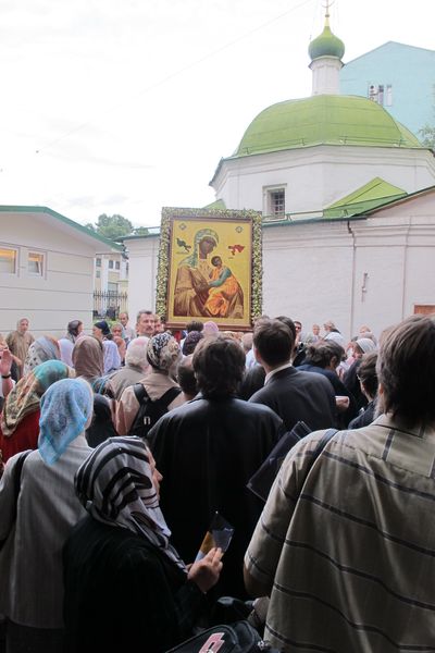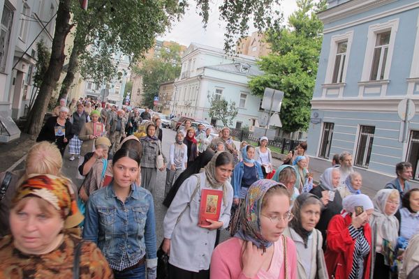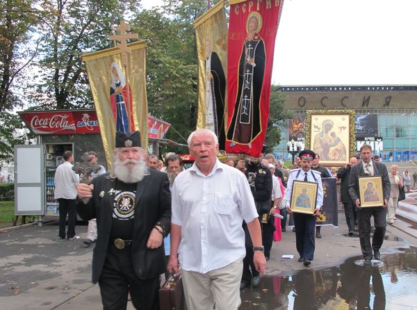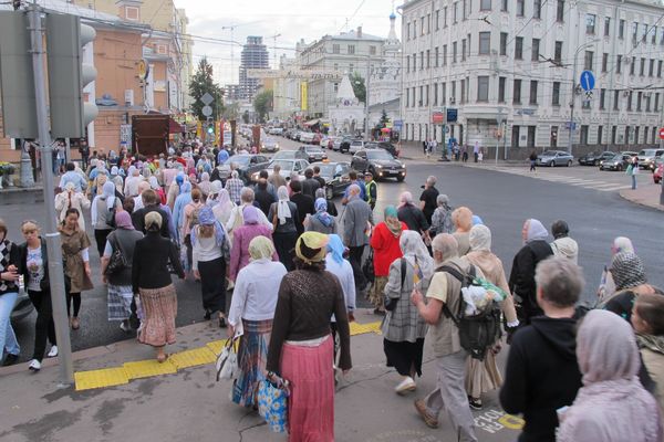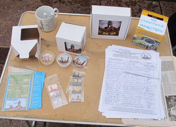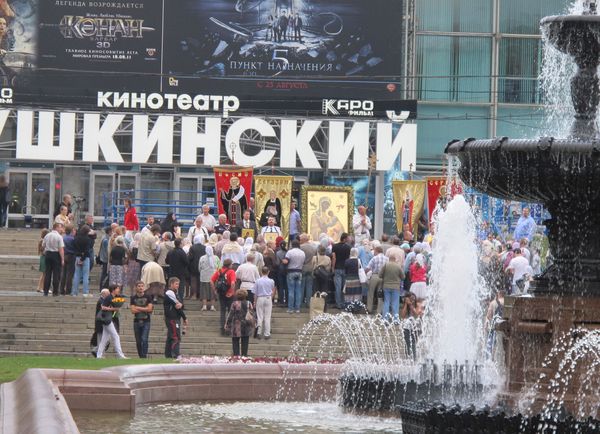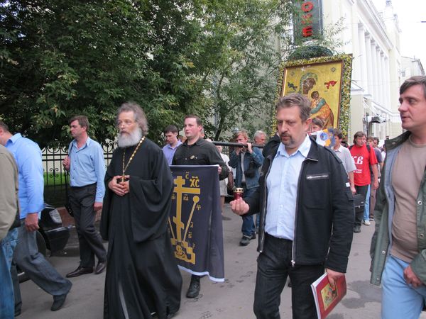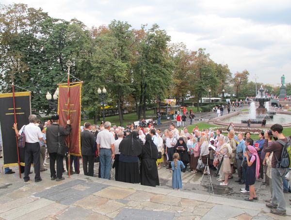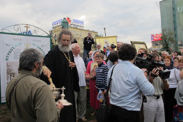 Молебен на месте Страстного монастыря (ФОТО)26 августа в 18.30 на Пушкинской площади состоялся праздничный молебен и крестный ход в память о 370-летии со дня принесения в Москву иконы Божией Матери "Страстная". После молебна на площади была открыта памятная таблица с информацией о том, что раньше здесь стояла одна из знаменитейших московских обителей - женский Страстной монастырь. Молебен начался ровно в половину седьмого вечера на ступенях кинотеатра "Пушкинский", там, где раньше располагался один из храмов разрушенного в 1937 году Страстного монастыря. Площадь жила обычной жизнью. На собравшихся помолиться почти не обращали внимания те, кто в этот день прогуливался по центру или отдыхал на скамейках рядом с кинотеатром. Молебен возглавил настоятель храма Успения Пресвятой Богородицы в Путинках протоиерей Алексий Гомонов. Всем желающим раздавали красочные книги с текстом акафиста иконе Божией Матери "Страстная", в честь которой был построен Страстной монастырь. На месте разрушенной обители молились самые разные люди. Совсем маленькие... ...и умудренные опытом. Кого-то больше интересовали удачные снимки. Других - газеты и листовки, которые раздавали на площади. Любой желающий мог оставить пожертвование на восстановление Страстного монастыря или поставить подпись за сохранение исторического облика Пушкинской площади. После молебна отец Алексий обратился к собравшимся с проповедью. Священник кратко рассказал об истории монастыря и о том, при каких обстоятельствах начались и продолжились молебны и крестные ходы на Пушкинской площади в наше время. Руководитель движения "Бородино 2012" Г. П. Сальников рассказал, что после молебна на площади будет открыт памятный знак о Страстном монастыре. Также он отметил, что следующая цель - поставить на Пушкинской площади часовню. После проповеди верующие приложились к иконам... ...и начался крестный ход. Крестным ходом прошли до установленного памятного знака. Г.П. Сальников (справа в белой рубашке) шел во главе хода. В ожидании открытия памятного знака. Торжественные моменты: открытие... ... и освящение. После освящения памятной таблицы верующие прошли крестным ходом по периметру Пушкинской площади... ... и снова собрались на ступенях кинотеатра. После крестный ход с молебным пением Пресвятой Богородицы направился к Успенскому храму. В Успенском переулке. Икона Божией Матери во дворе Успенского храма. Люди выстаивались в очередь, чтобы приложиться к иконе. Потом образ внесли в храм. Между тем во дворике также раздавали листовки и газеты. Для всех пришедших устроили угощение во дворе храма.