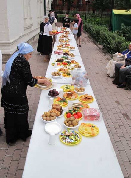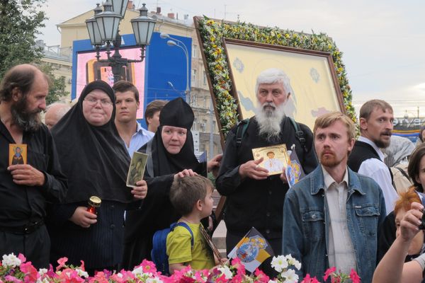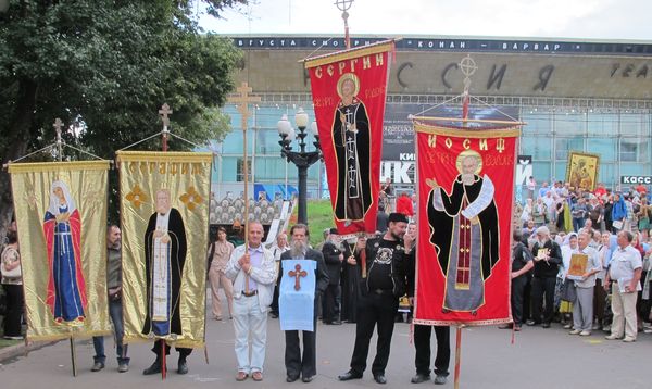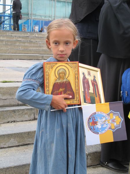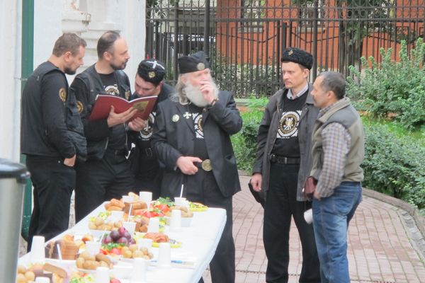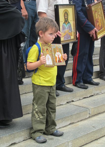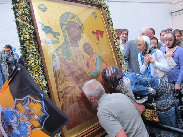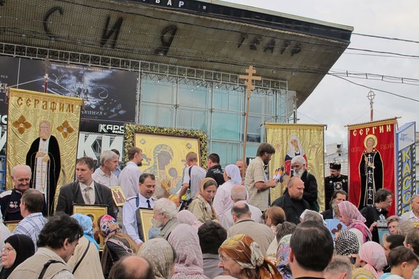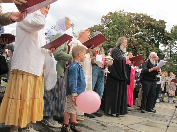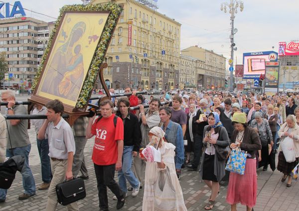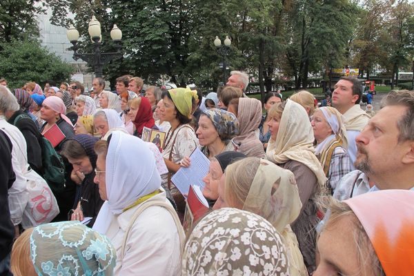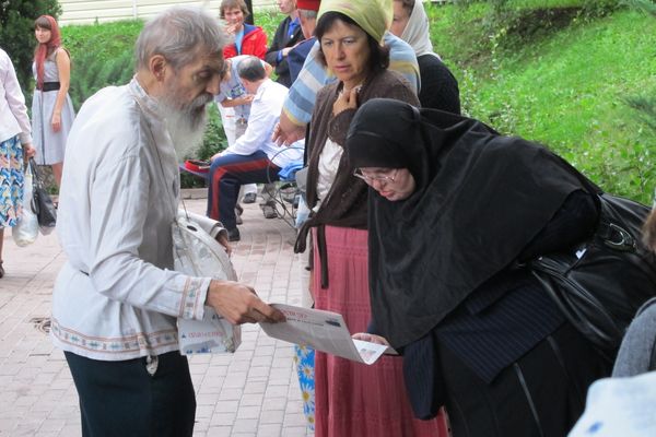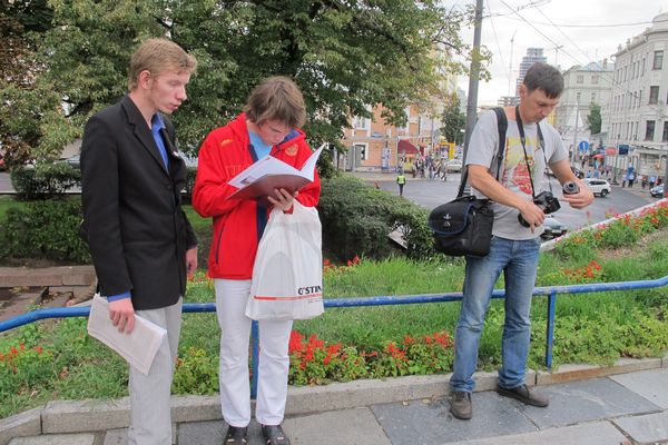 Молебен на месте Страстного монастыря (ФОТО)26 августа в 18.30 на Пушкинской площади состоялся праздничный молебен и крестный ход в память о 370-летии со дня принесения в Москву иконы Божией Матери "Страстная". После молебна на площади была открыта памятная таблица с информацией о том, что раньше здесь стояла одна из знаменитейших московских обителей - женский Страстной монастырь. Молебен начался ровно в половину седьмого вечера на ступенях кинотеатра "Пушкинский", там, где раньше располагался один из храмов разрушенного в 1937 году Страстного монастыря. Площадь жила обычной жизнью. На собравшихся помолиться почти не обращали внимания те, кто в этот день прогуливался по центру или отдыхал на скамейках рядом с кинотеатром. Молебен возглавил настоятель храма Успения Пресвятой Богородицы в Путинках протоиерей Алексий Гомонов. Всем желающим раздавали красочные книги с текстом акафиста иконе Божией Матери "Страстная", в честь которой был построен Страстной монастырь. На месте разрушенной обители молились самые разные люди. Совсем маленькие... ...и умудренные опытом. Кого-то больше интересовали удачные снимки. Других - газеты и листовки, которые раздавали на площади. Любой желающий мог оставить пожертвование на восстановление Страстного монастыря или поставить подпись за сохранение исторического облика Пушкинской площади. После молебна отец Алексий обратился к собравшимся с проповедью. Священник кратко рассказал об истории монастыря и о том, при каких обстоятельствах начались и продолжились молебны и крестные ходы на Пушкинской площади в наше время. Руководитель движения "Бородино 2012" Г. П. Сальников рассказал, что после молебна на площади будет открыт памятный знак о Страстном монастыре. Также он отметил, что следующая цель - поставить на Пушкинской площади часовню. После проповеди верующие приложились к иконам... ...и начался крестный ход. Крестным ходом прошли до установленного памятного знака. Г.П. Сальников (справа в белой рубашке) шел во главе хода. В ожидании открытия памятного знака. Торжественные моменты: открытие... ... и освящение. После освящения памятной таблицы верующие прошли крестным ходом по периметру Пушкинской площади... ... и снова собрались на ступенях кинотеатра. После крестный ход с молебным пением Пресвятой Богородицы направился к Успенскому храму. В Успенском переулке. Икона Божией Матери во дворе Успенского храма. Люди выстаивались в очередь, чтобы приложиться к иконе. Потом образ внесли в храм. Между тем во дворике также раздавали листовки и газеты. Для всех пришедших устроили угощение во дворе храма.