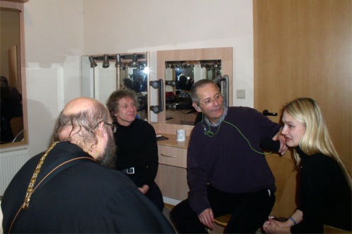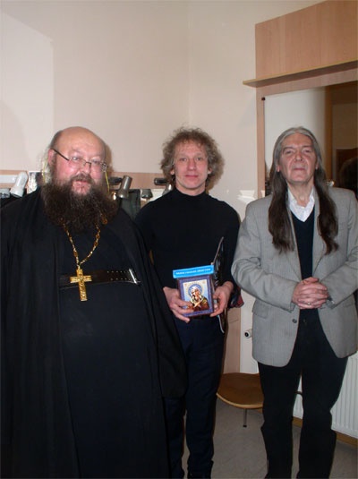 Игумен Сергий (Рыбко) побывал на концерте русского виртуоза-балалаечника Алексея Архиповского10 ноября 2011 г. в Театральном Зале ММДМ прошёл концерт знаменитого русского виртуоза-балалаечника Алексея Архиповского. На нём по приглашению Алексея Архиповского, побывал известный православный миссионер, настоятель Московского Храма Св.Сергия Радонежского и Храма Св.Духа Сошествия игумен Сергий (Рыбко), а также координатор Союза Православных Братств и эксперт Совета православных объединений при Синодальном отделе РПЦ по взаимодействию Церкви и общества Юрий Агещев. Юрий Агещев рассказал для ИА "Русские Новости" о концерте и общении с Алексеем Архиповским: Все было замечательно. Благодарим Алексея и его администратора Михаила Сергеева за приглашение. Не часто, увы, так приходится отдохнуть душой. Зал рукоплескал маэстро, и было за что. Казалось, все слилось в этот вечер во едино: одухотворенные лица собравшихся (собрались "и млад и стар"), прекрасные (просто космические!...) трели балалайки, аплодисменты, благоговейная тишина и восторг!... В Алексее мы узрели замечательного Русского человека. Скромного и не пафосного. Он рассказал нам много интересного. Например, о том, что игрой на балалайке увлекался Цесаревич Алексий - сын Государя Николая Александровича. Наши Святые Страдальцы за Святую Русь (от бесовской мировой антихристовой скверны и прочего кагала) очень почитаемы Алексеем Архиповским. Он верно о них заметил: "Это наши предстатели и молитвенники пред Господом...!" Было и совместное интервью Алексея и отца Сергия для Би-би-си. Ник Байкер (Nick Baiker), хотя по началу и с трудом, но уразумел, что между нашей Церковью и народной музыкой нет никакого антогонизма, и что наши Пастыри прекрасно знают толк в Русской народной и мировой музыке. Да и в роке!... Кстати, на концерте звучали как известные народные композиции, так и авторские композиции Алексея, да и было немало вписанных туда "рок вставок". Очень интересным было повествование о грядущем концерте Алексея с ударником легендарного рокера Frank Zappa (+1993 г.). "....В 1971 году, во время концерта "Frank Zappa & The Mothers" в Монтрё (Швейцария) начался пожар, при котором сгорело и здание, в котором проходил концерт, и аппаратура группы. Предположительно, один из швейцарских фанов выпустил на концерте сигнальную ракету, что и стало причиной пожара. Это событие примечательно тем, что оно увековечено в хите "Smoke on the Water" находившейся в тот день в том же городе группы Deep Purple, текст которого был навеян этим пожаром и его дымом, стелющимся по воде Женевского озера. Deep Purple приехали тогда в Монтрё для записи нового альбома ("Machine Head", выпущен в 1972 году) на мобильной студии, и включили в него свеженаписанную песню, ставшую одним из самых узнаваемых хитов в истории рок-музыки". Вручили Алексею наши скромные дары: иконку, церковные календари и прочее. Так же пригласили Алексея с соратниками в храм, настоятель которого о.Сергий. Скоро у о. Сергия будет освящена старинная балалайка маэстро. Отмечу, что по прибытии во храм после концерта, здравие отца Сергия (накануне чувствовавшего себя не очень хорошо) весьма улучшилось, достигнув лучших показателей (по всем медпараметрам) за прошедший месяц, что было отмечено р.Б. Светланой из сестричества во имя Святителя Игнатия Брянчанинова. Его духовно окормляет игумен Сергий (Рыбко). И да поможе