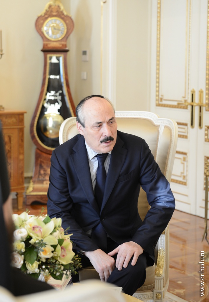 «Для меня это очень важно — я знаю, какую роль Русская Православная Церковь играла и играет в Российском государстве, — подчеркнул Президент Республики Дагестан. — Русская Православная Церковь всегда была вместе с народом, она укрепляла и сохраняла российскую государственность, и Вы очень достойно, на высоком уровне продолжаете это дело. Поэтому дагестанцы разных национальностей и разных вероисповеданий испытывают к Вам величайшее уважение, слушают Ваши проповеди, Ваши речи и очень много ценного берут для себя, чтобы найти выход из тяжелейшей ситуации, — всё это есть в Ваших словах».