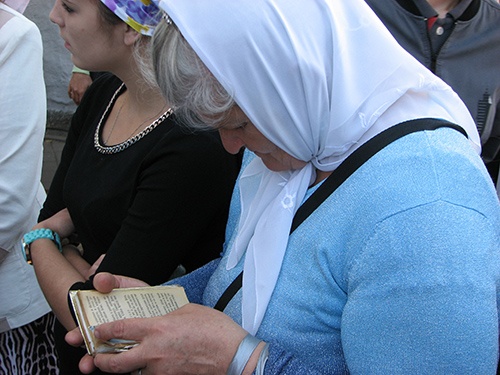 Служебное пение и все возглашения слышны хорошо — подзвученные качественной усилительной техникой, которая установлена на микроавтобусе у храмовой ограды. Столь же внятно слышно и прекрасное пение мужского хора — сегодня это четверо из митрополичьего хора под управлением о. Николая Кацы, разместившихся под другим высоким деревом.