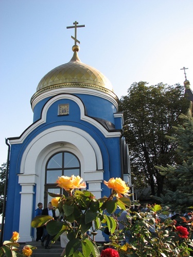Слева, рядышком, высится голубенькая, с золотым шлемовидным куполом, часовня в честь иконы Божией Матери «Знамение» Курской Коренной, возведенная над глубинной скважиной и освященная митрополитом Иоанном совсем недавно, в 2010 г.