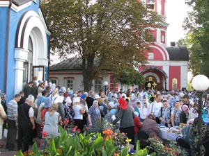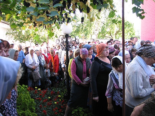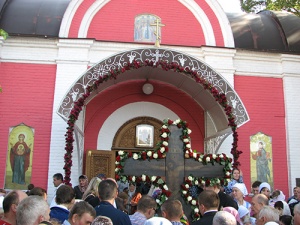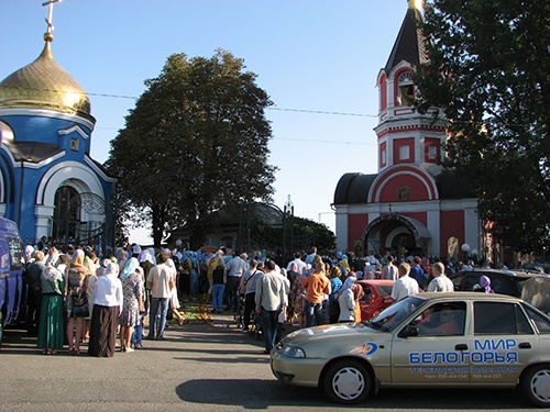 …У входа в храм очень людно. Праздничная служба идет в церковном дворе, правит ее в этом году протоиерей Олег Кобец, настоятель кафедрального Преображенского собора Белгородской и Старооскольской епархии, в сослужении двух протоиереев — настоятеля Крестовоздвиженского храма Иоанна Борчука и благочинного прихода свв. мучениц Веры, Надежды, Любови и матери их Софии Сергия Колия.