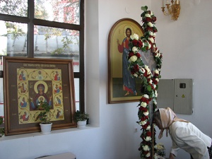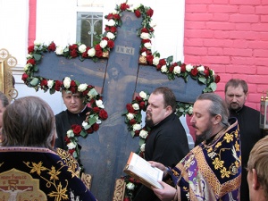 Отец Олег произносит прочувствованное слово о празднике, о разысканиях Креста Господня царицей Еленой, о сопутствовавших этим событиям чудесах, говорит о восхождении Христа на Крест, о духовном космическом смысле этого события, прилагая его к жизни и крестной ноше каждого христианина.