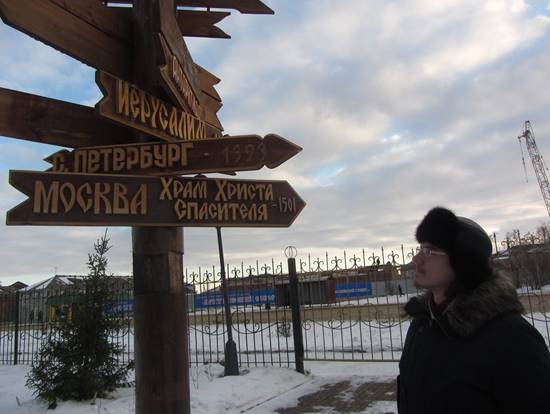 возле стелы с указателями важных направлений или Слава Богу, я здесь! Не стыдно поведать, что в период акклиматизации часто хотелось спать несмотря на послушания; иногда на полчаса отключался, сидя на рабочем месте. Однажды меня, спящего в компьютерном кресле, заметил шедший в свой кабинет Владыка. Не знаю почему, я проснулся за секунду до того, как он остановился и с добродушной улыбкой спросил: «Спите, отец Антоний?». Сонный диакон ответил какую-то несуразицу наподобие: «Да, Владыка, сплю, спать хочется!..». Но теперь в свободное время «не сидится», и берёшься за факультативные задачи: написать статью, найти литературу для просивших того учащихся Воскресной школы и пр. Иногда люди из расширяющегося круга местных друзей приглашают в гости, где получают свой выплеск и эмоции, и чувство юмора – просто душа раскрывается! А когда не хватает родных – звонишь им, когда начинаются искушения – молишься, а станет скучно – общаешься с замечательными, эмпатийными, искренними местными жителями и служителями или идешь на прогулку в тундру (на зиму планируются лыжные прогулки).