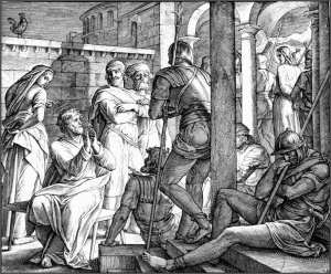 Пилат вошел в историю как палач Сына Божиего и одновременно — вот парадокс! — как свидетель Его невиновности, «проповедник Твоего незлобия» (из чинопоследования Пассии). Пилат хотя и не таков уже, как безупречно доблестные древние римляне (это подчеркивает святитель Василий), но он все же воспитан римским правом и не лишен понятий о законности и справедливости. Однако эти понятия в нем оказываются бессильными. В той же Пассии говорится, что он «руце убо своя умы, но сердце оскверни». Ритуально умыв руки перед иудеями, римский прокуратор, как ему казалось, снял с себя ответственность за судьбу Галилеянина… Но на самом-то деле он ее, эту невыразимо страшную и непреходящую ответственность, на себя взял и в том расписался на знаменитой табличке (см.: Ин. 19, 19–22).