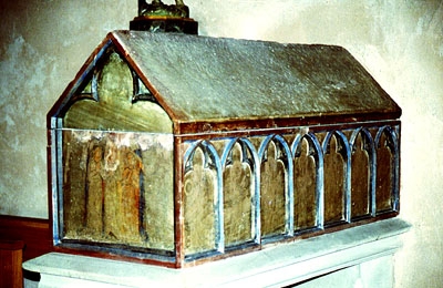 Над саркофагом расположены скульптуры (слева-направо): св. мученика Христофора (250), свв. мучениц Веры, Надежды, Любови и Софии, епископа Ремигия, основателя аббатства.
