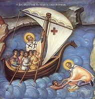 Корабль, плывший по Средиземному морю, внезапно попал в страшный шторм. Громадные волны грозили вот-вот потопить судно. Люди потеряли всякую надежду — гибель казалась им неотвратимой. Восстает бурный ветер и высоко поднимает волны, [которые] восходят до небес, нисходят до бездны; душа [человека] истаивает в бедствии (Пс 106. 25–26). В столь решительную минуту морякам пришла спасительная мысль обратиться с молитвой к святому Николаю, которого никто из них никогда не видел, но все слышали, что Мирликийский архиепископ является скорым помощником в бедах. Корабельщики стали взывать к милостивому Николаю, и надежда на Божьего угодника не обманула их. Святитель, словно ангел, тотчас появился на корме судна и произнес: «Вы звали меня, и я пришел избавить вас от смерти». Ободрив экипаж, подражатель Христа Николай усмирил море, как некогда сделал это Сам Спаситель. И исполнилось слово Господа: Верующий в Меня, дела, которые творю Я, и он сотворит (Ин 14. 12).