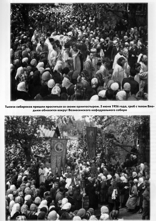В Сибири старцу-архипастырю представилось необозримо-великое церковное поприще. В первые послевоенные годы ему было временно поручено управление сначала Владивостокской, а затем Красноярской епархиями. Территория подведомственных ему епархий простиралась от Тюмени на западе до Владивостока на востоке; от города Енисейска на севере, до Тувинской Автономной области на юге. При открытии храмов он посылал на места своего секретаря — протодиакона Олега Зырянова4. Ради скорейшего устроения церковных дел, архипастырь, несмотря на свой преклонный возраст, сам совершал поездки по епархии. Он служил в храмах Иркутска, Омска, Тюмени, Ишима, Тобольска. Несколько раз ездил в Барнаул, Красноярск, Бийск. Во время этих поездок он освящал церкви, рукополагал священников, постоянно заботился о пожертвованиях для нужд Красной Армии.