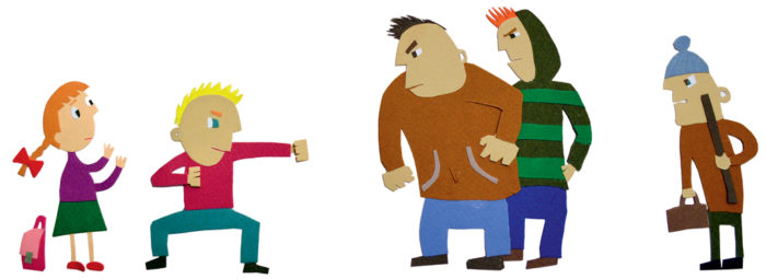 В подростковом периоде у ребят с этим все гораздо сложнее, чем в детстве. Пара лет разницы в возрасте делает противника недосягаемым для симметричного ответа. Тут все влияет — и физическое развитие (между 16 и 14 годами — целая пропасть), и статусный момент — "старшие" неприкосновенны. Но, пожалуй, тяжелей всего переживается какой-то иррациональный животный страх, который обалдуи-старшеклассники умеют внушать ребятам всего-то на пару-тройку лет младше их самих. У нас в школе сложилась разновозрастная гоп-компания, находившая для себя радость в унижении тех, кто в нее не входил. Причем речь не шла об избиениях. Это была сложная многоступенчатая система морального подавления, состоявшая из подзатыльников, оплеух, пинков под зад, оскорблений, публичных "наездов" и множества других мелких пакостей, делавших жизнь невыносимой. Вот у этой шайки и попали под раздачу мои сыновья в самом непростом своем возрасте.