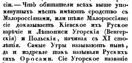 Илл. 2. Нежинская гимназия высших наук (лицей кн. Безбородко) Не являясь профессиональным историком, И.С. Орлай вносил посильный вклад в изучение истории Отечества. В 1804 г. в журнале «Северный вестник» издана статья Орлая «История о карпато-россах, или о переселении россиян в Карпатские горы и о приключениях с ними случившихся.» [4]. К сожалению, в этой дебютной работе автор, увлёкшись изложенной в заглавии идеей, насчитал в древности пять (!) переселений русского народа в Карпаты и Венгрию, допустил при попытке толкования происхождения русского этнонима наивные этимологические трактовки и иные упущения. В течение 1813-15 гг. Орлай посылает работавшему при Московском университете научному «Обществу истории и древностей российских» копию рукописи, обнаруженной им в Перемышле, «… что на червонной Руси, касающейся до жителей малой России, сиречь белой, червонной и черной Руси, стонавших некоторое время под игом польским …». В 1823 г. Иван Семёнович был принят в члены названного «Общества», «принимал самое активное участие в его деятельности, снабжая общество … рукописями, редкими книгами, картами и отчасти собственными сочинениями.». Он поддерживал переписку с членами «Общества», выполнял их научные просьбы, вёл собственные исторические и этнографические поиски. Вершиной научно-исторических и этнографических изысканий Ивана Семёновича стала небольшая, но ёмкая работа, изданная в 1826 г., «О Юго-Западной Русии.»[5] Её цель - напомнить учёным мужам Русской империи о едва не забытом ими дальнем юго-западном крае России и её «Руском народе». В этой статье Орлай излагает многочисленные доказательства русскости коренного населения юго-западной Руси; рассмотрим из неё некоторые места. Автор заслуженно упрекает учёных соотечественников: «Сия часть России до такой степени упущена из виду русскими писателями, что они ее нередко описывали, да и ныне описывают под названием Польши, и, что весьма удивительно, и Г. Бантыш-Каменский ... о возникшей унии утверждает, что уния сия возникла в Польше.» (с. 222). И. Орлай пеняет писательской братии державной Руси: «Самые писатели русские галицкие и поднесь еще не приняты в число русских писателей, каковыми они в самом деле были, а причислены к литературе польской …» (с. 223). Жителей «Юго-Западной Русии» автор именует «малороссиянами» и среди доказательств их русскости приводит данное им в IX веке венграми имя-экзоэтноним «орос» (венг. «русский»): «Что обитатели всех выше упомянутых мест имеют сродство с малороссиянами, или те же малороссияне: сие доказывает киевское их русское наречие и летописи угорские (венгерские) и польские, начиная с XI столетия. Самые угры называют ныне, да и издревле так называли русских сих оросами..» (с. 225; илл. 3). Он напоминает, что «…всю Россию называют они и поднесь Орос Биродалом, то есть, Русская держава.» (с. 227). Кстати, венгроязычная версия сайта посольства Венгрии в Российской федерации называет РФ Oroszorzag [6]. Орлай приводит и прочие имена «Карпаторуских жителей», в «летописях угорских – Rutheni или Russi Karpatici» (с. 227).