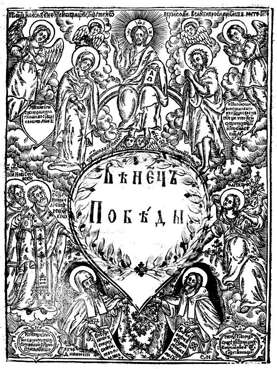 Панегирик князю А.Д. Меншикову «Венец Победы». Львов. 1709 г.Эта небольшое по объёму, в несколько листов, издание посвящено Александру Даниловичу Меншикову, оно напечатано Львовским Успенским ставропигиальным братством к прибытию князя во Львов осенью 1709 г. (точная дата неизвестна). «Венец Победы» - хвалебные вирши, панегирик Александру Даниловичу как одному из полководцев-участников недавней Полтавской баталии. Ранее, в 1707 г., Петр I «посетил Львов и одарил щедро» разорённое поборами короля Карла XII Львовское братство, тогда же А.Д. Меншиков пожертвовал на Успенскую братскую церковь 300 золотых [1]. Братчики не преминули отблагодарить своего благодетеля и воспеть недавнее торжество русского воинства. Барочная традиция издания украшенных иллюстрациями стихотворных посвящений была распространена в русских землях Речи Посполитой ещё в XVII столетии. Титульный лист «Венца Победы» - многосоставная, наполненная религиозным смыслом гравюра (илл. 1). По верхнему краю оттиснуты слова Нагорной проповеди (Мф. 7:7-8): «Просите и дастся вам; ищите и обрящете; толцыте и отверзется вам. Всяк бо просяй приемлет.». Ниже размещён Деисус — восседающий на небосводе Вседержитель, к Которому молитвенно обращены Богородица и Иоанн Предтеча. Подножие Вседержителя образуют два херувима, по сторонам которых слова Псалтири (118:58): «Помолихся лицу твоему всем сердцем моим, помилуй мя по сло(весе твоему).». Ниже - сердцеобразная рамка с заголовком «Венец Победы», основание которой держат преподобные Антоний и Феодосий Печерские. В руке у Антония свиток с надписью, «Во сердци моем сокрих словеса Твоя ...» (Пс. 118:11), на свитке Феодосия начертано: «Воззвах всем сердцем моим, услыши мя, Господи ...» (Пс. 118:145). С правой стороны «сердце» придерживает ангел хранитель, с левой - свт. Николай Мирликийский, за ним стоит Иоанн Новый Сочавский. Символика гравюры титульного листа отражает религиозно-мировоззренческие убеждения создателей книги: дарование победы русскому воинству - милость Божия, Его награда по молитвам Богородицы и святых за искреннюю, от чистого сердца веру, за благочестие.