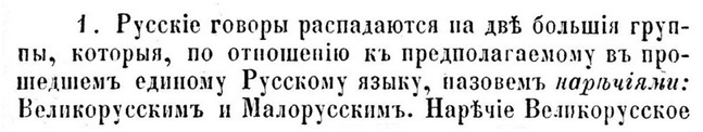 1.Русские говоры распадаются на две большия группы, которыя, по отношению к предполагаемому в прошедшем единому Русскому языку, назовем наречиями: Великорусским и Малорусским. Наречие Великорусское состоит из двух поднаречий - Южнаго и Севернаго, которыя названы, по весьма важному признаку, именно по произношению неударяемаго о, первое—речью высокою или свысока (на а), а второе низкою (на о). О дальнейших делениях Сев.-русскаго поднаречия и Мр. наречия скажем ниже, а здесь—несколько слов о Южно-Великорусском. Это последнее делят на собственно Юж.-Русское и Белорусское, Западное, по отношению к первому. О Белорусском давно уже было высказано мнение, что в нем нет ни одной звуковой черты, которая бы не повторилась хотя где нибудь в Великой России, и что, следовательно, говор Белорусский решительно принадлежит к группе Великорусских, при том Южных. Мы можем повторить то же самое, если исключим Бр. дж вместо ж из д и удвоение согласных вследствие их смягчения, и если, во избежание недоразумений, прибавим, что говоры с уо вм. о в среднем слоге (нам известен один такой, на юге от Белостока Гродн. губ., но их может быть больше) принадлежат к Мало-